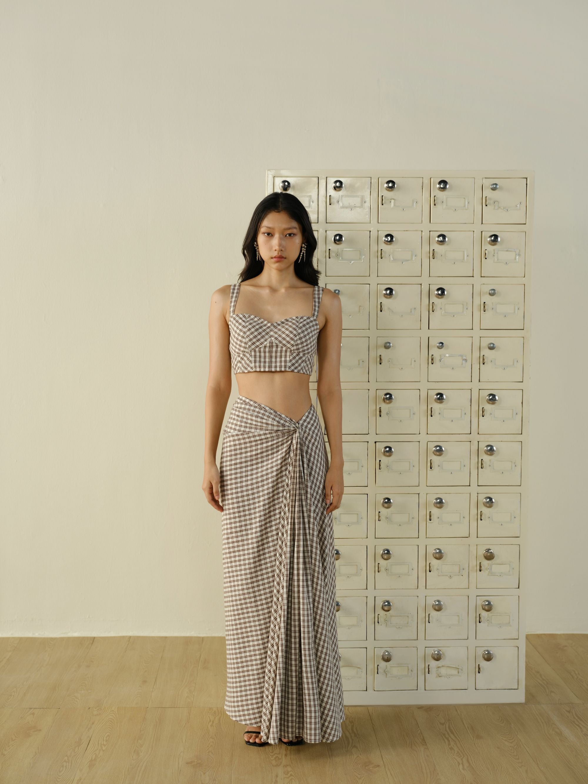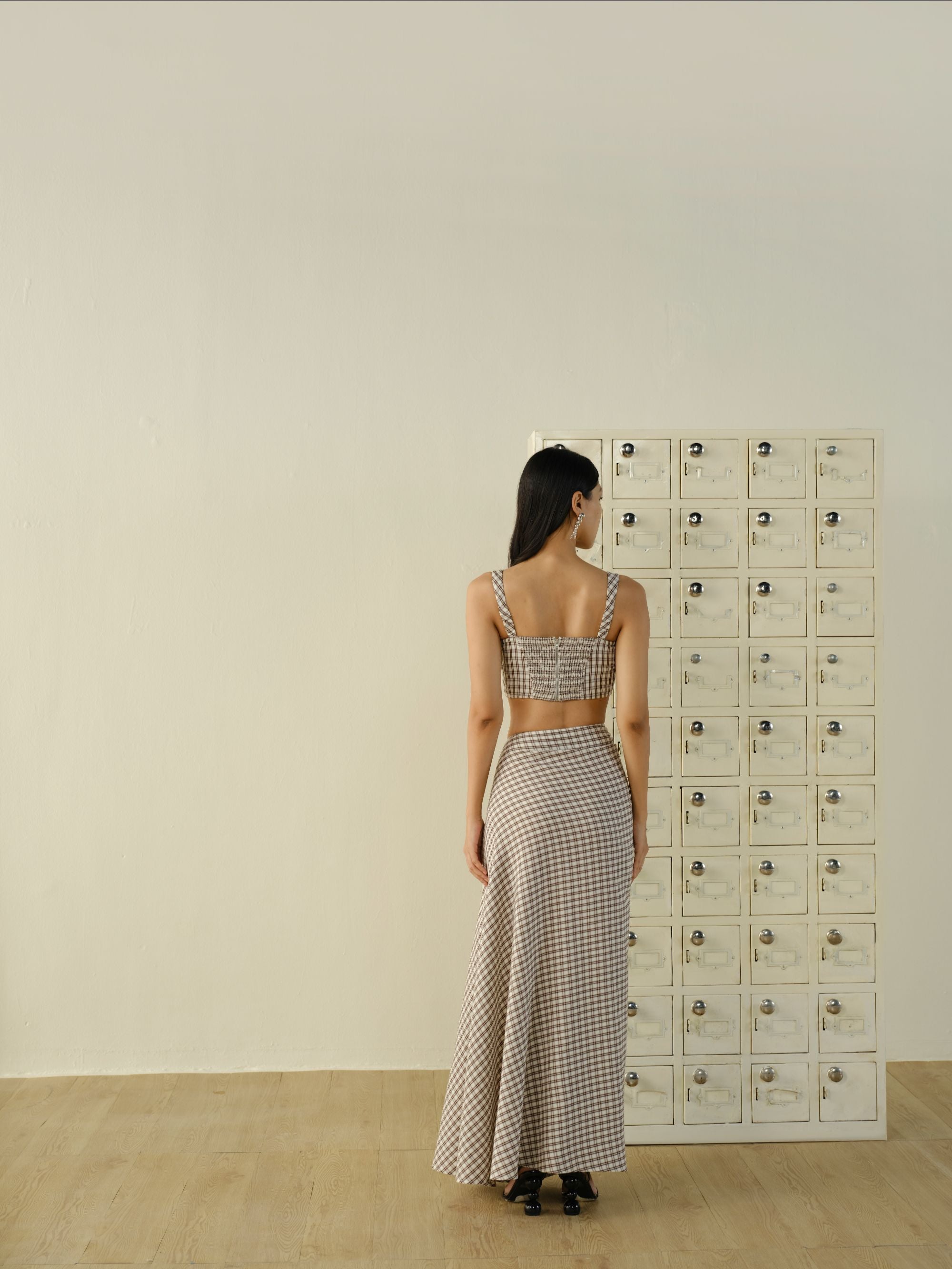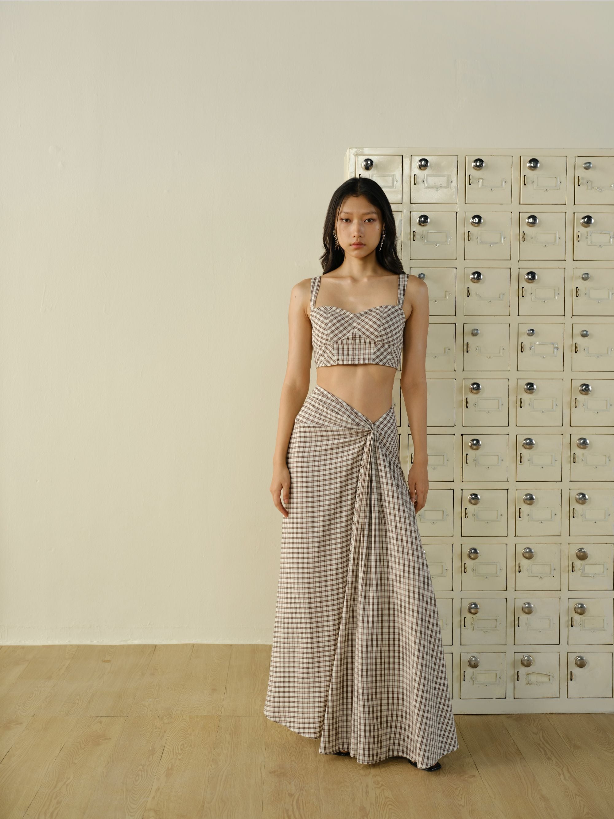 A SUBTLE CHECK BRALETTE PAIRS WITH A FLOWING, PLEATED SKIRT. THE SILHOUETTE FEELS RELAXED, YET ELEGANTLY TAILORED. MINIMAL DETAILS KEEP THE LOOK UNDERSTATED. TOGETHER, THE SET FLOATS WITH EFFORTLESS CHARM.