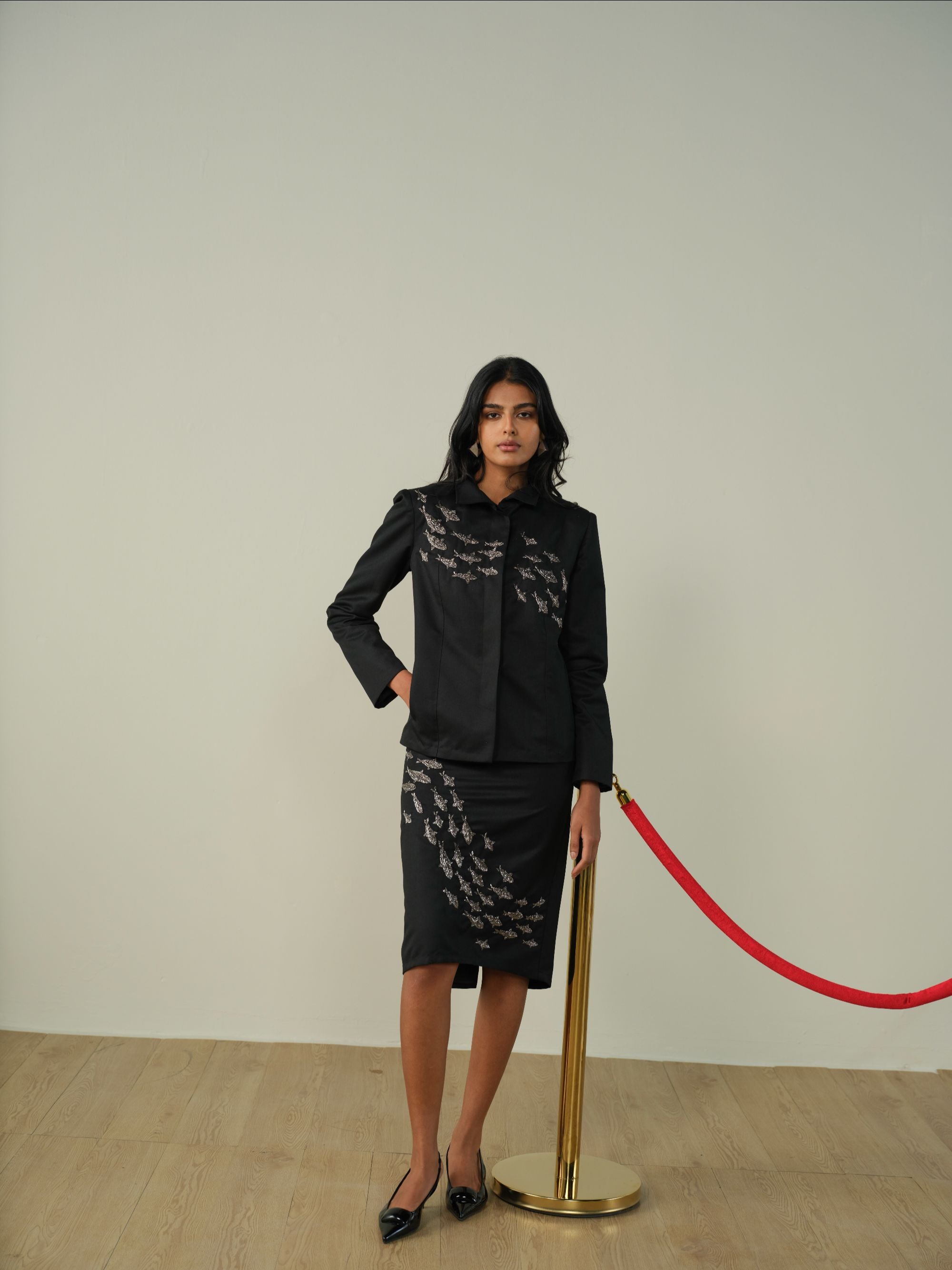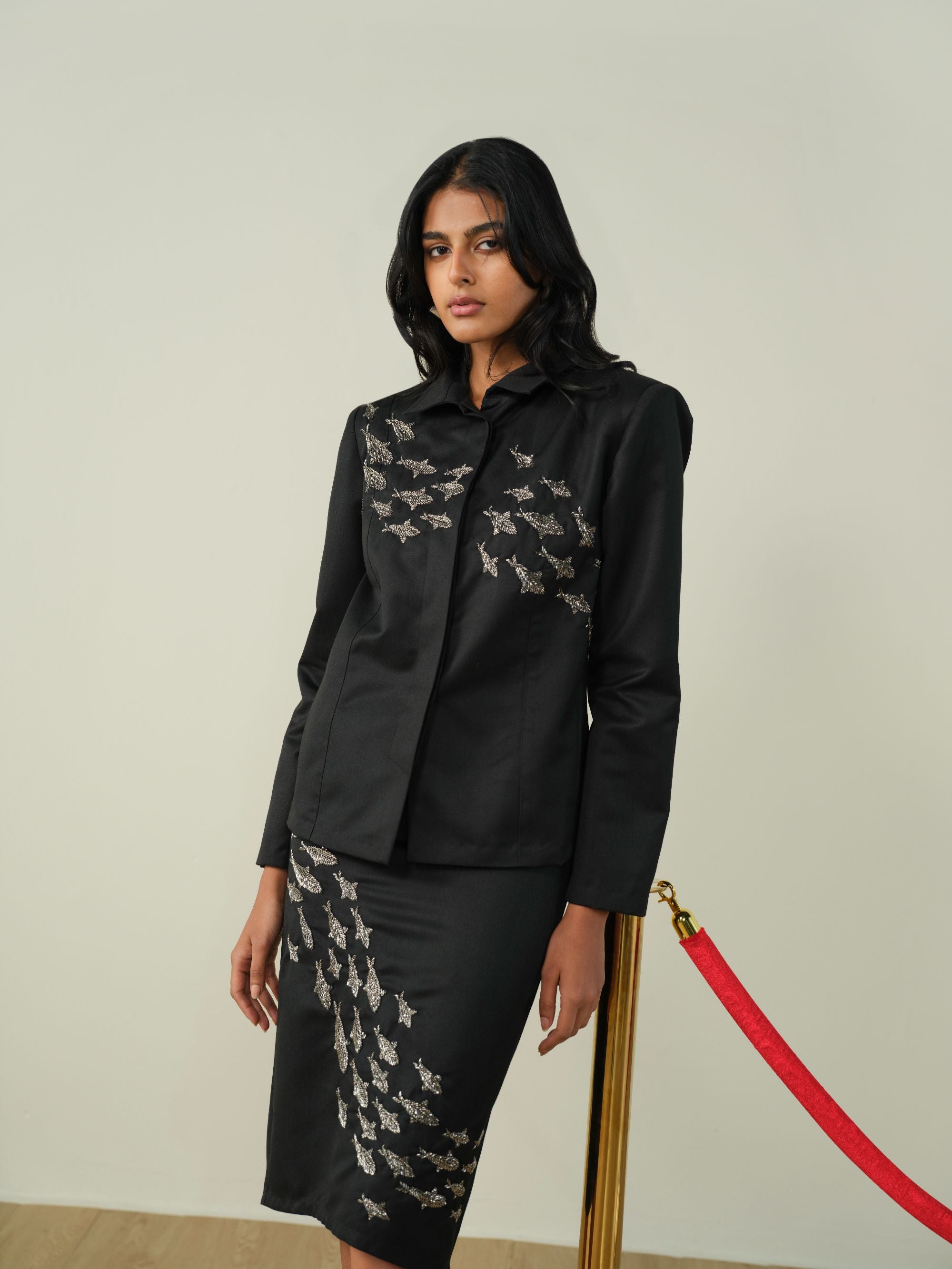 ART MEETS TAILORING IN THIS BLACK SET, FEATURING A FISH-MOTIF BLAZER PAIRED WITH A HIGH-LOW SKIRT. SCULPTURAL LINES AND PRECISE FIT MAKE IT A MINIMAL YET BOLD STATEMENT.
