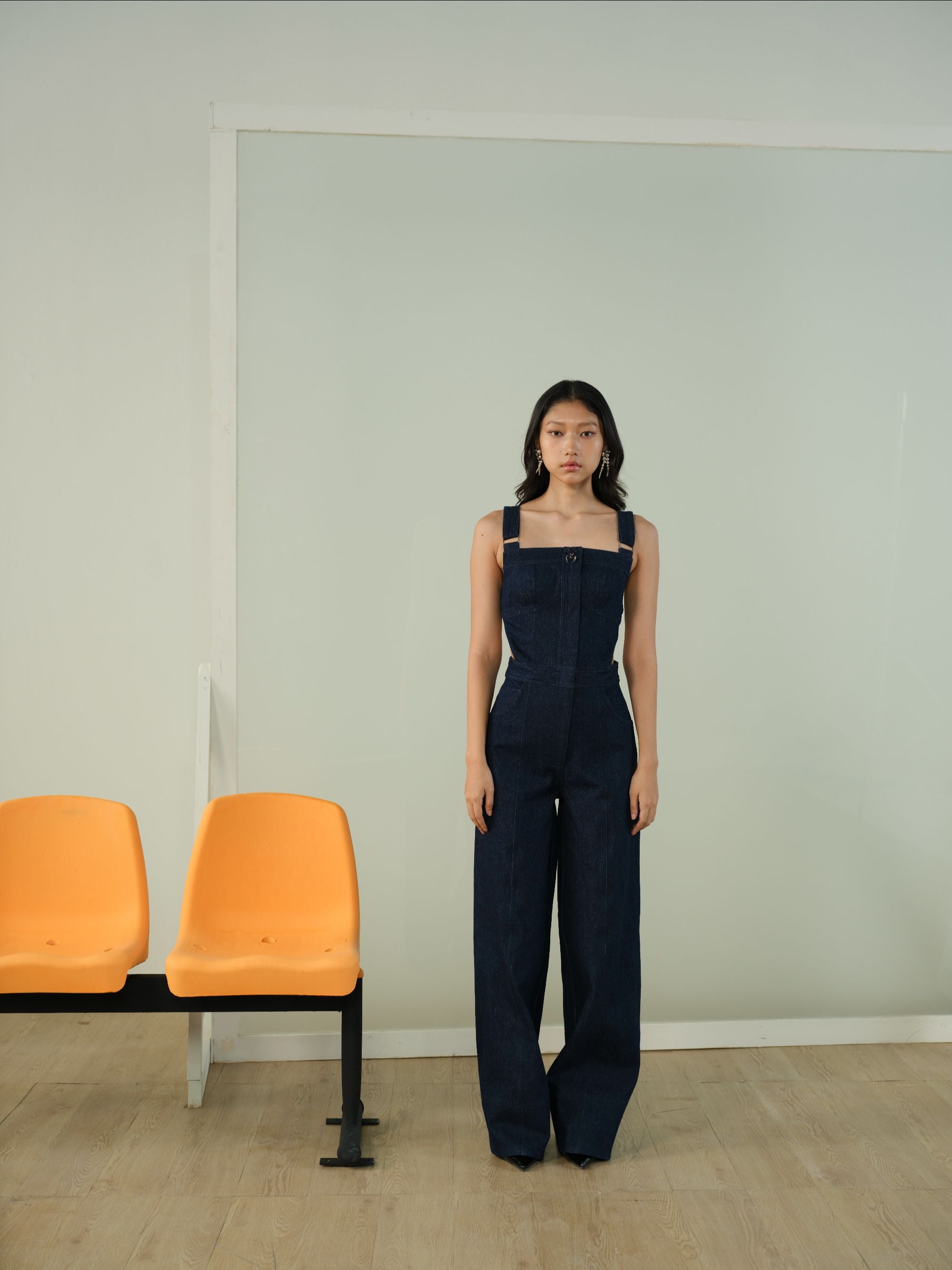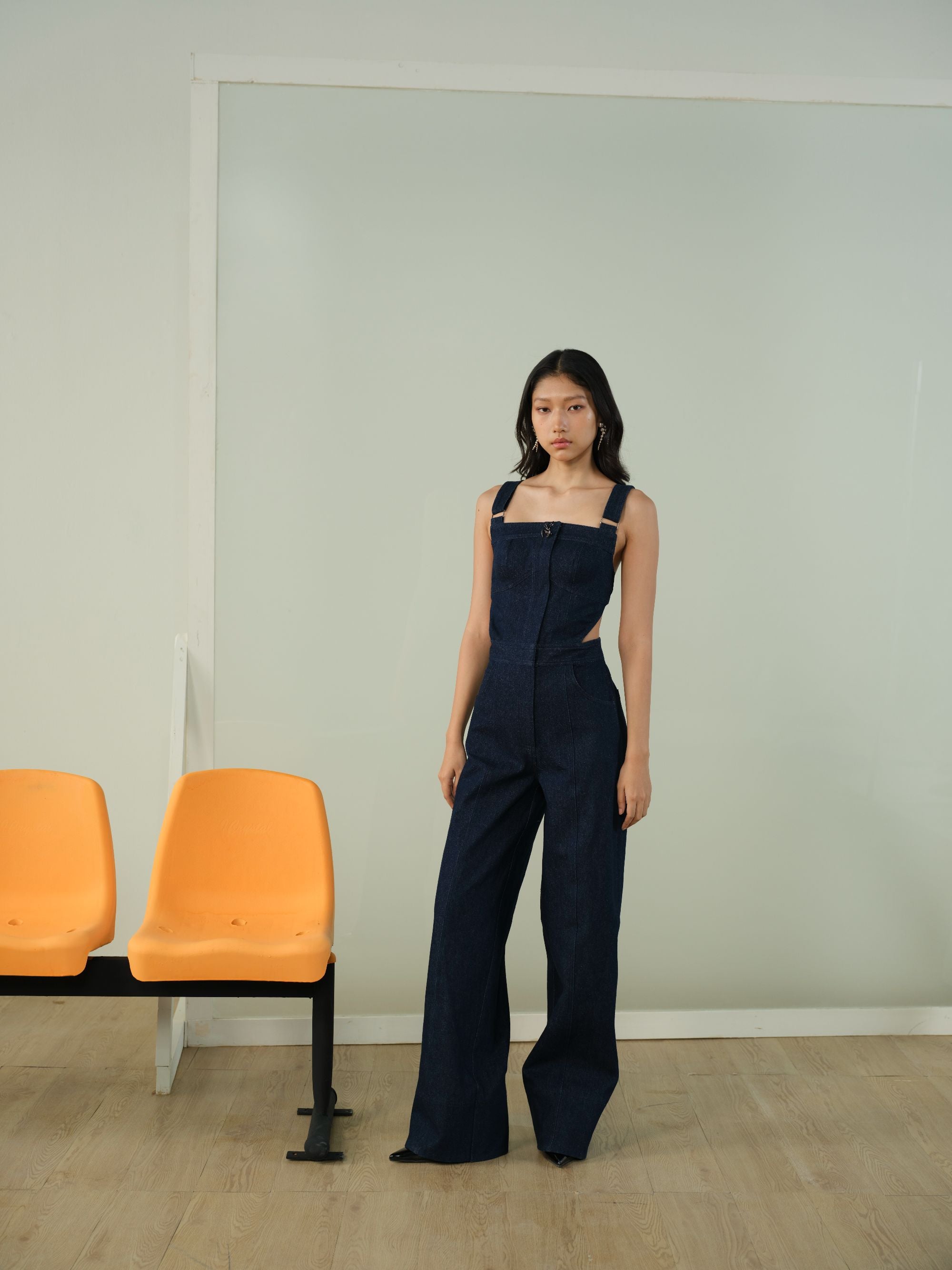 A PIECE MADE FOR IMPACT — THIS DENIM JUMPSUIT FEATURES CORSET DETAILING, A STATEMENT SPIDER BROOCH AND A FLATTERING CUTOUT DESIGN. THE SMOCKED BACK AND ADJUSTABLE STRAPS ENSURE A SECURE FIT, WHILE THE WIDE LEG CREATES A REFINED, TAILORED FINISH.