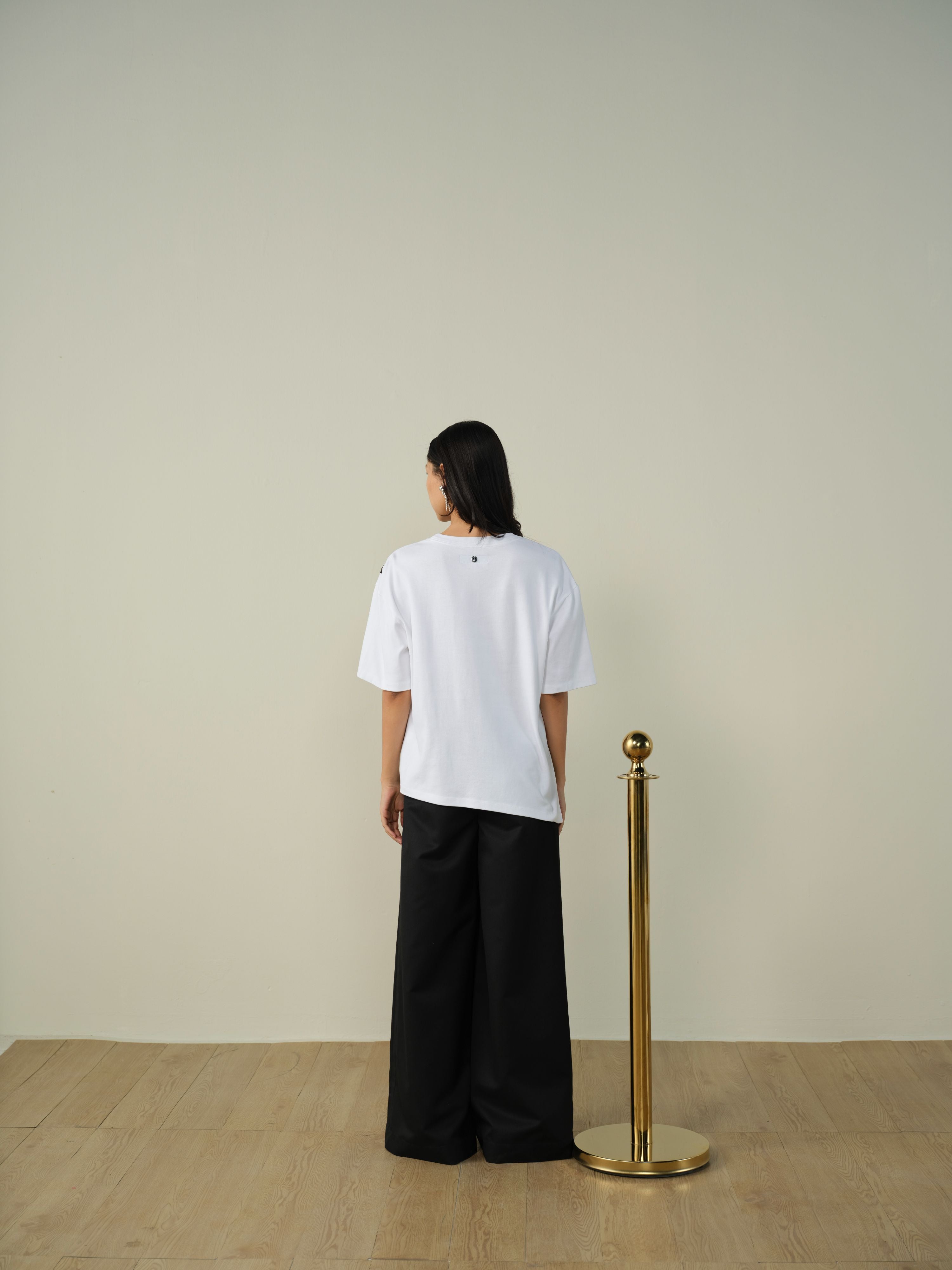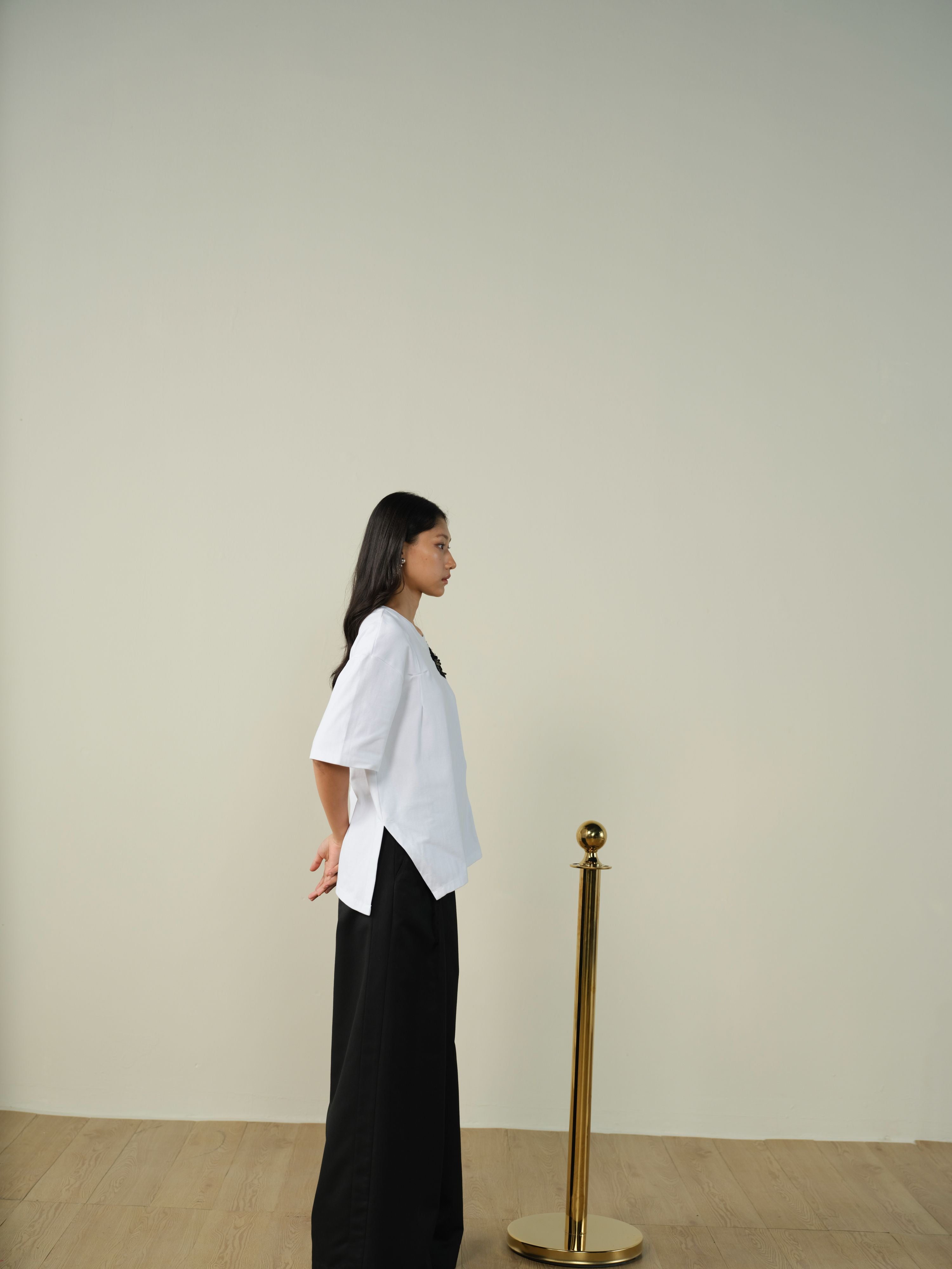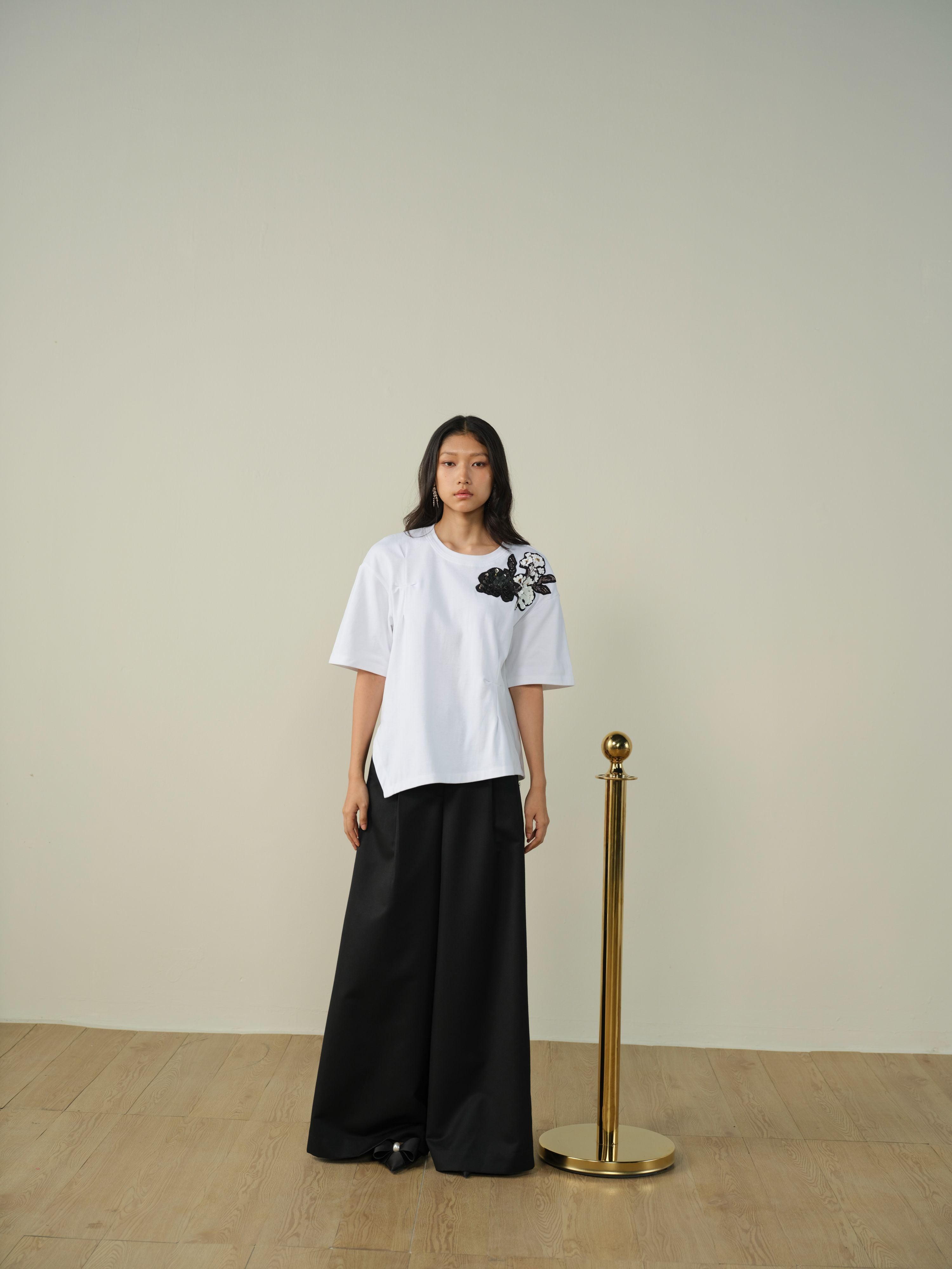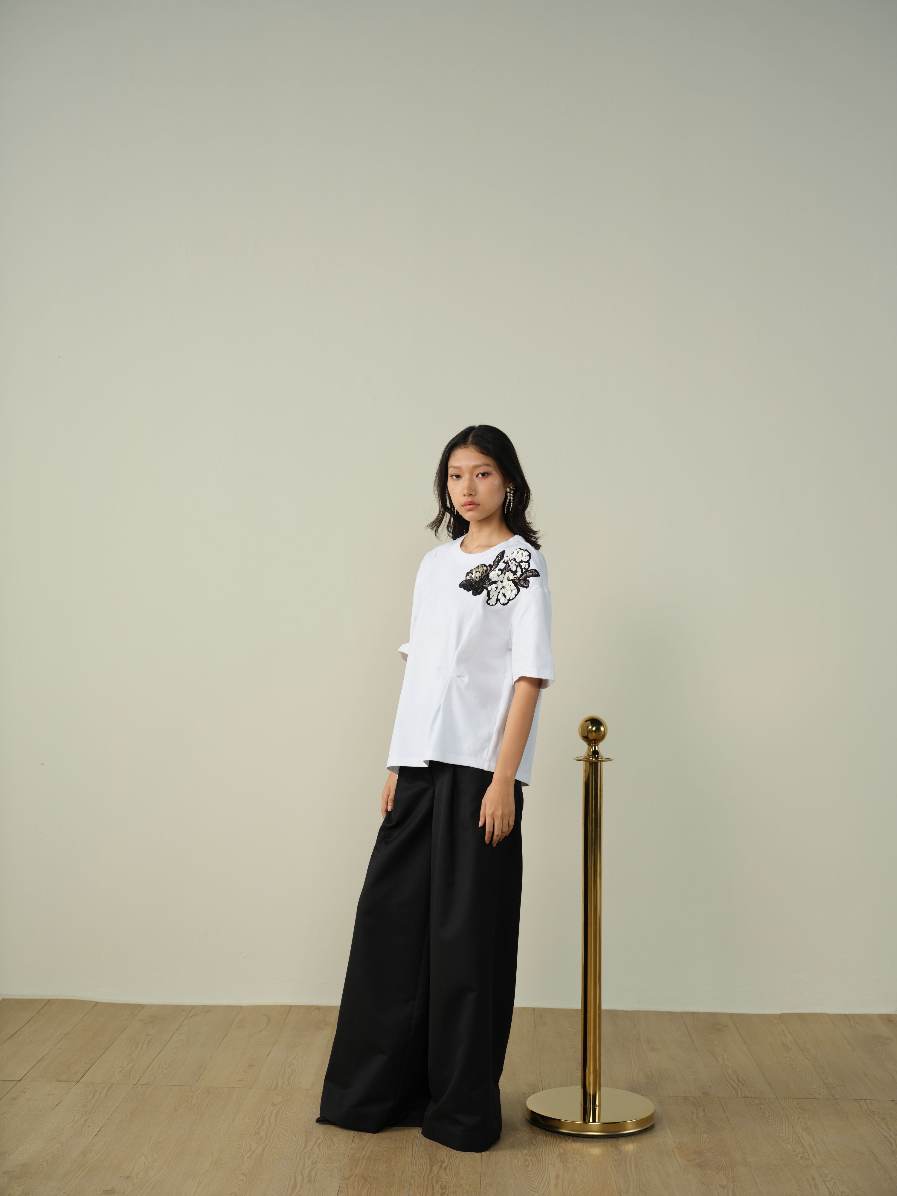 A PLAY OF TEXTURE AND LINE: FLORAL PATCHES, A GENTLE CINCH, AND AN OFF-BALANCE HEM THAT BRINGS MODERN FLUIDITY TO A SIMPLE TEE.