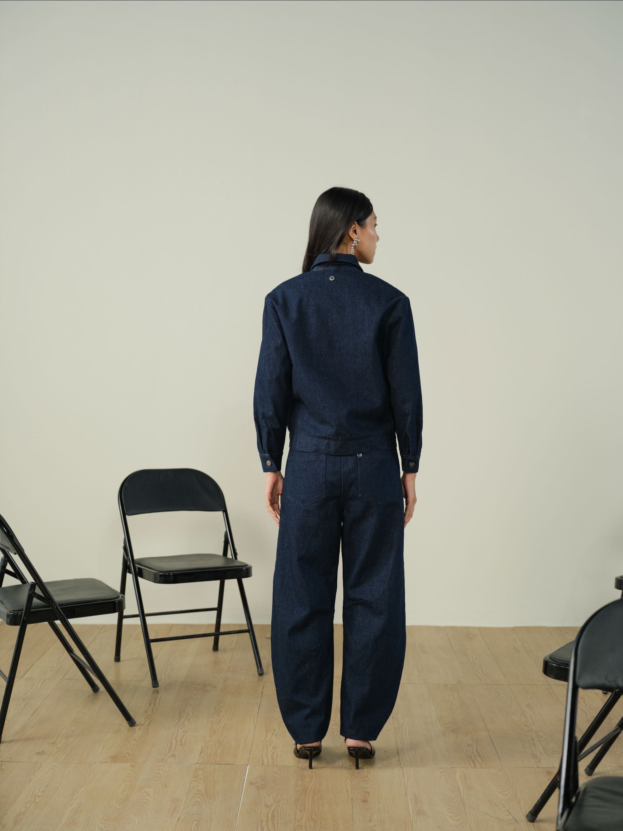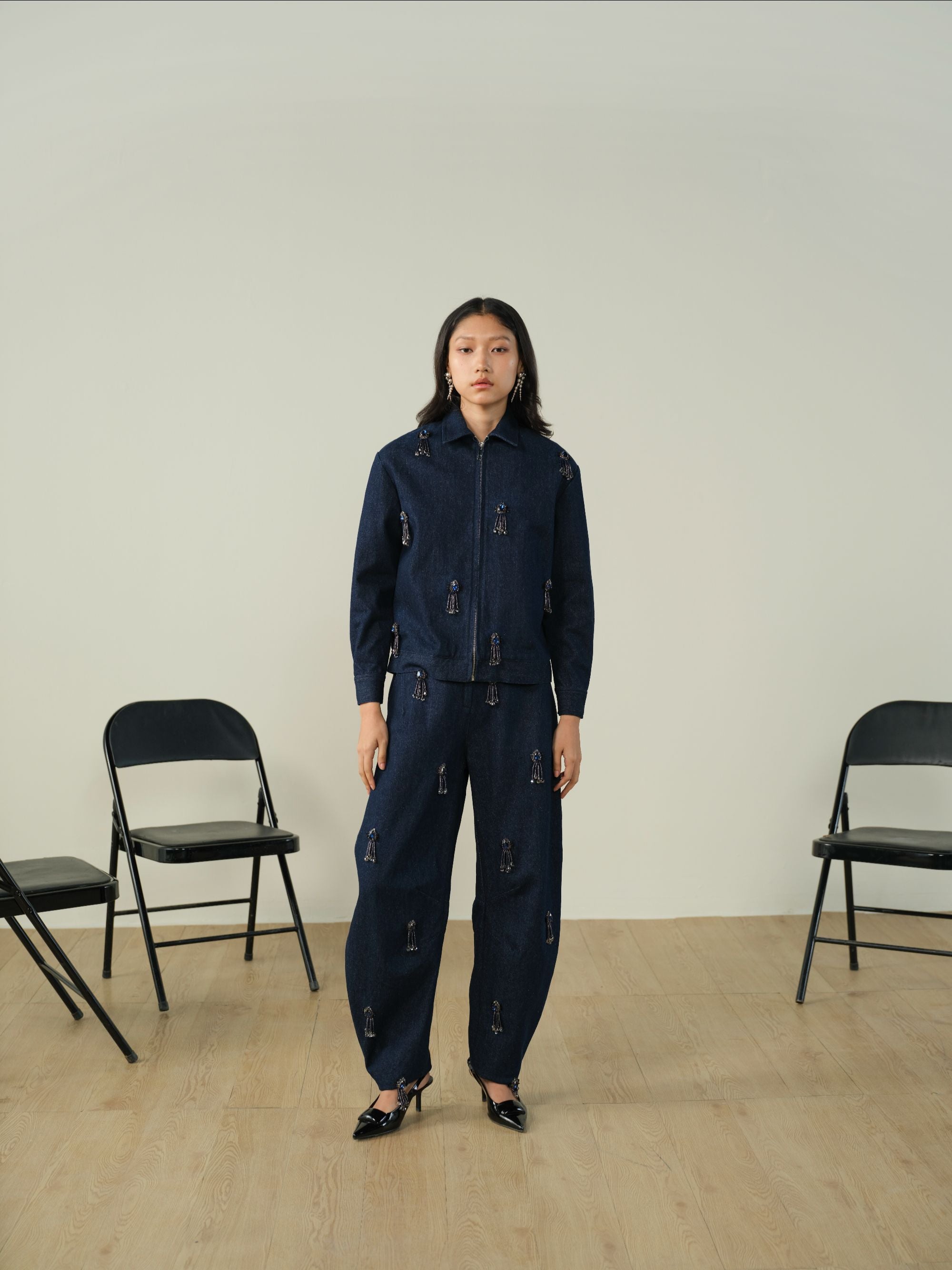STEP INTO MODERN EASE WITH THIS JEWELED DENIM SET. THE RELAXED JACKET AND HIGH-WAIST BARREL-FIT PANTS BLEND SUBTLE DETAILING WITH POLISHED TAILORING FOR A COORDINATED, EFFORTLESS LOOK.
