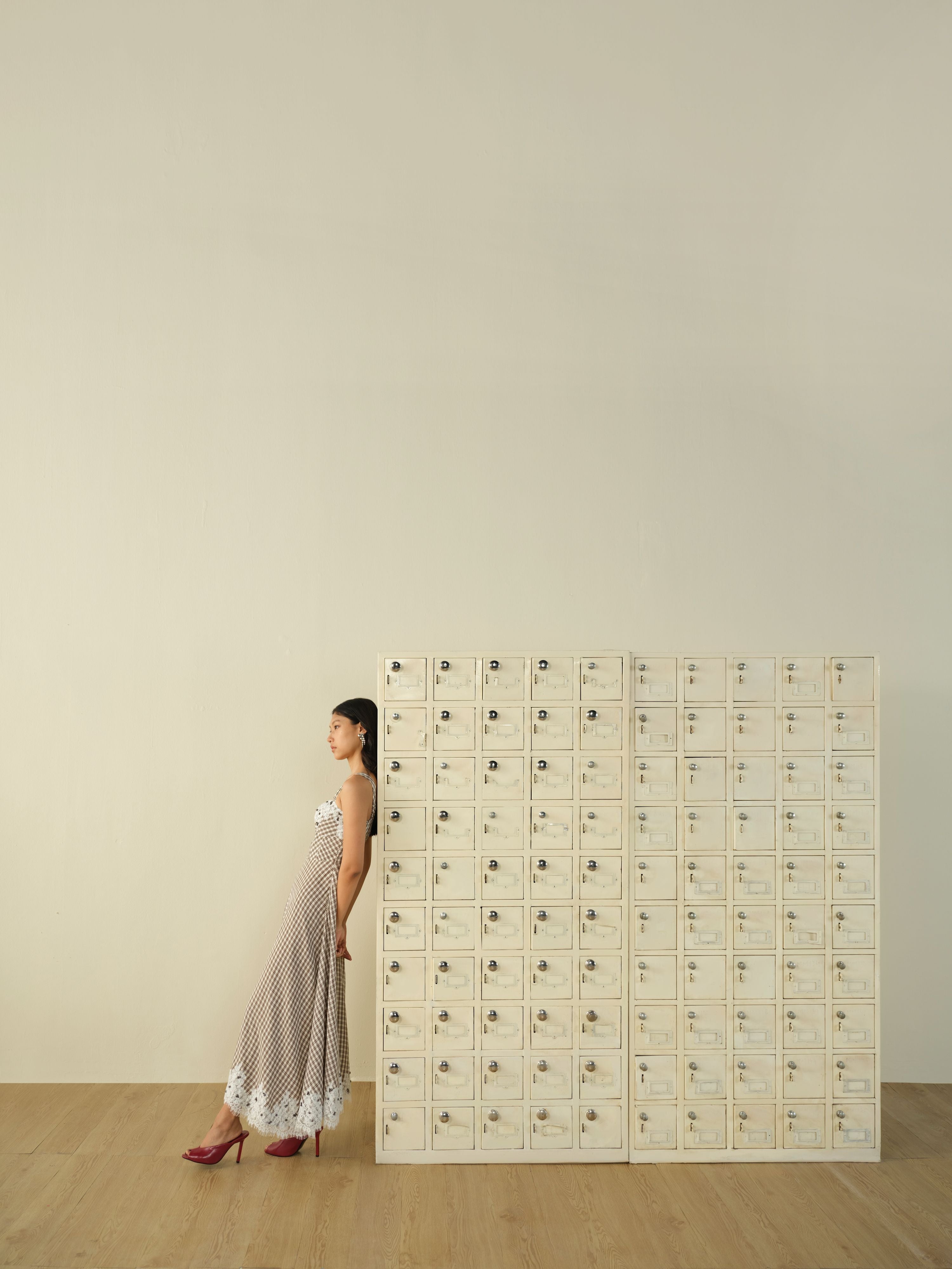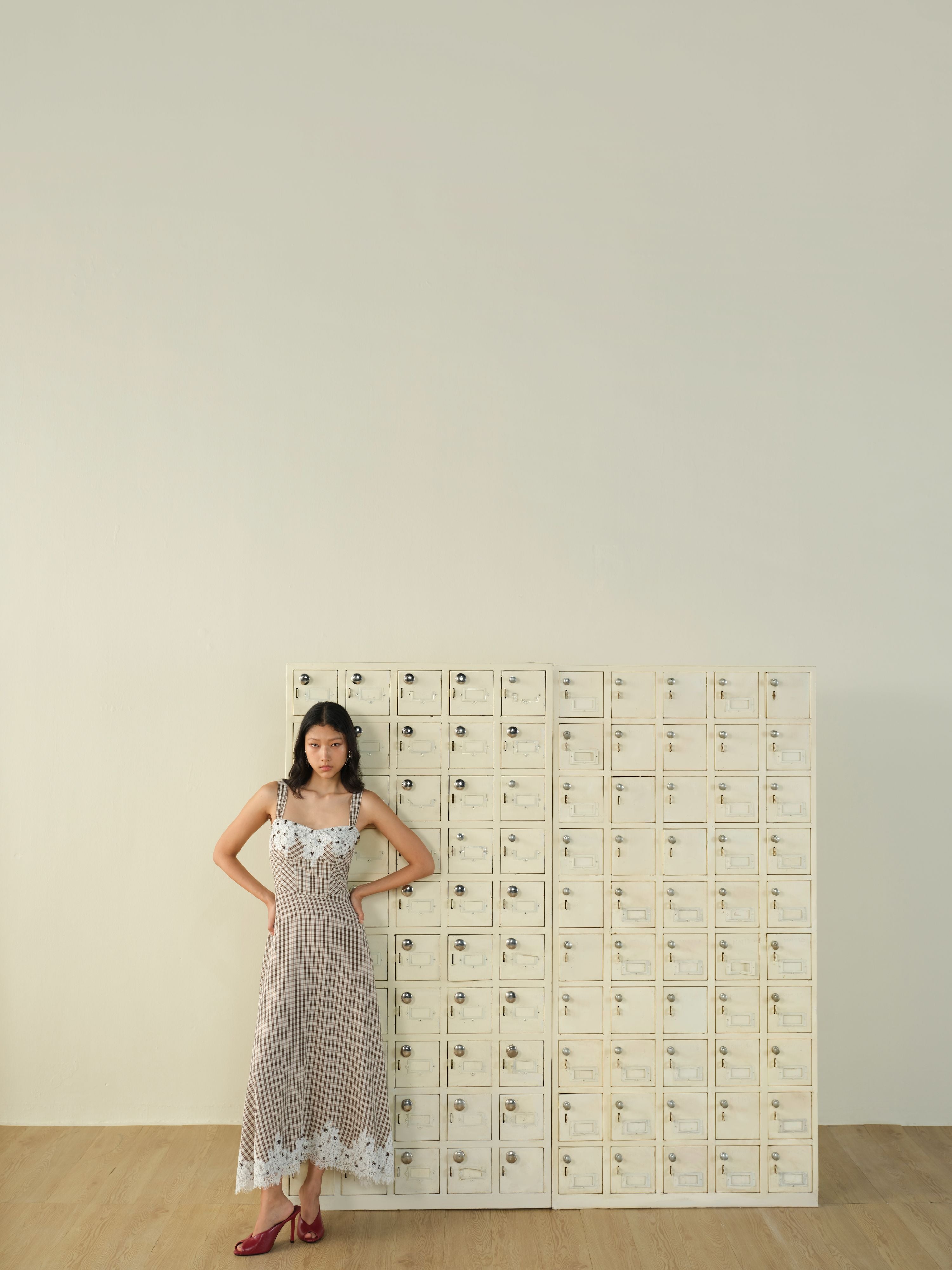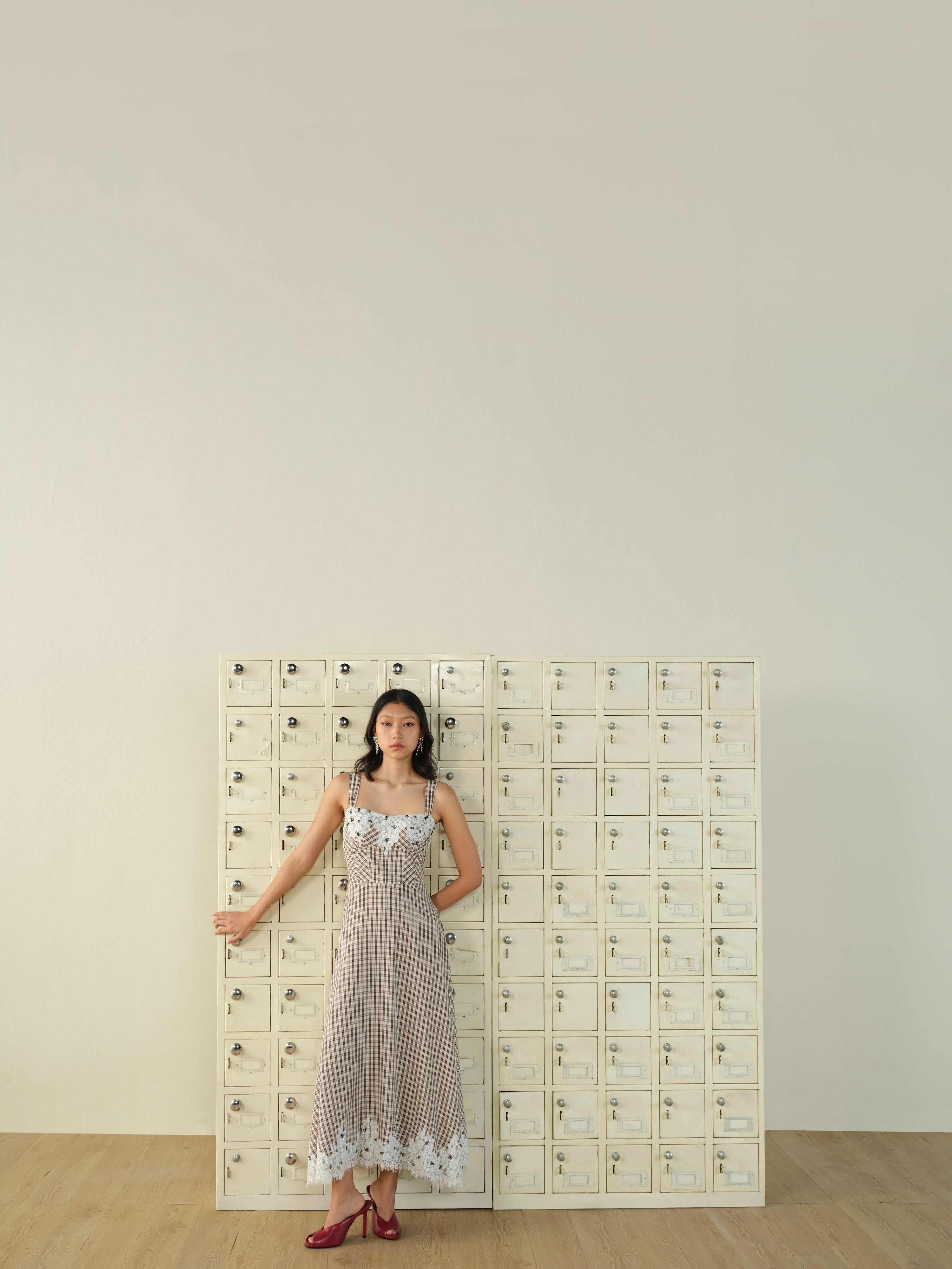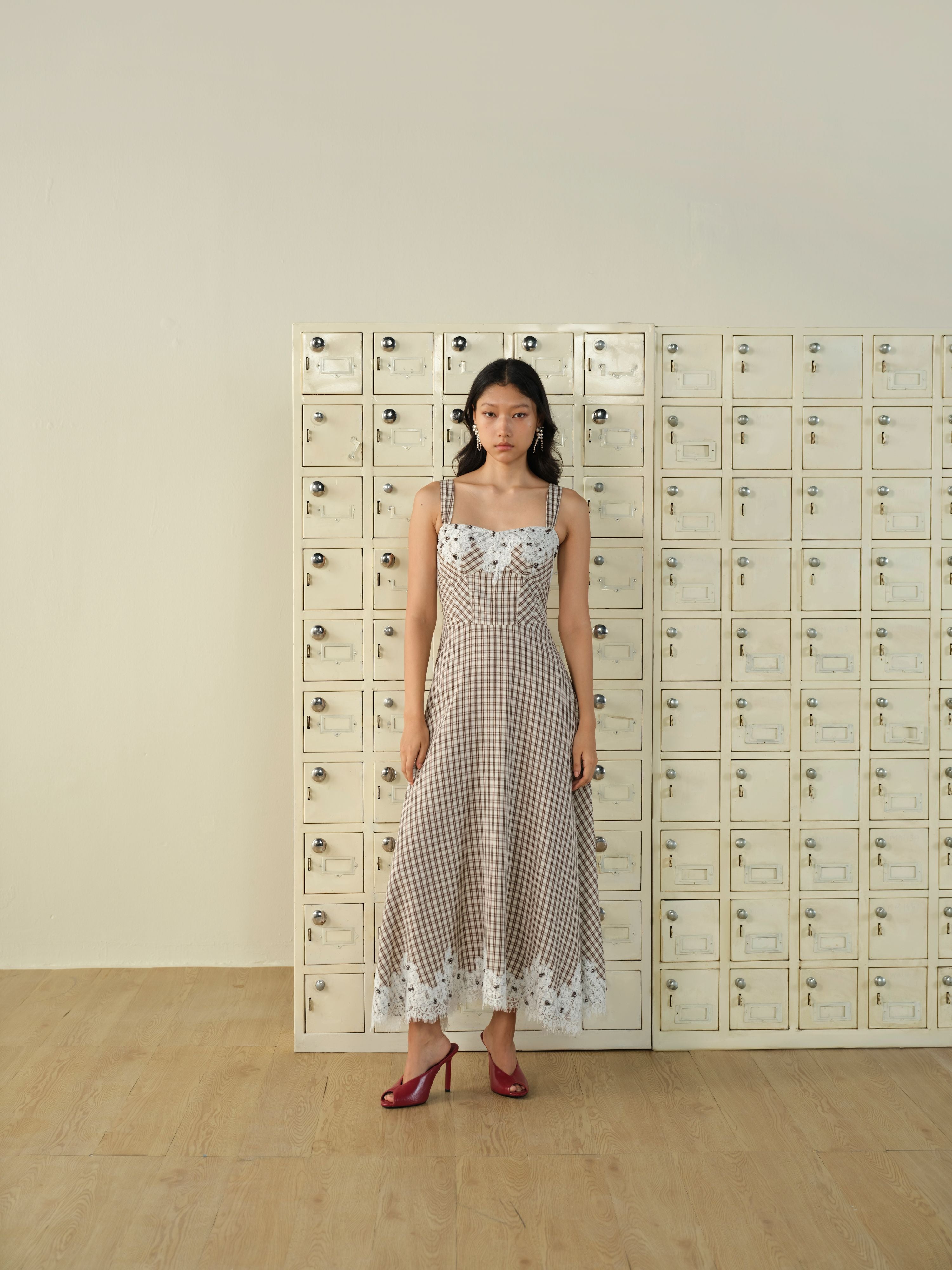 THIS CHECK DRESS REDEFINES STRUCTURE — CORSETED PANELS SCULPT THE FORM, WHILE LACE SPILLS ACROSS THE FRONT AND HEM IN A WHISPER OF CONTRAST. A TAILORED MIDI CUT DELIVERS REFINED DRAMA.