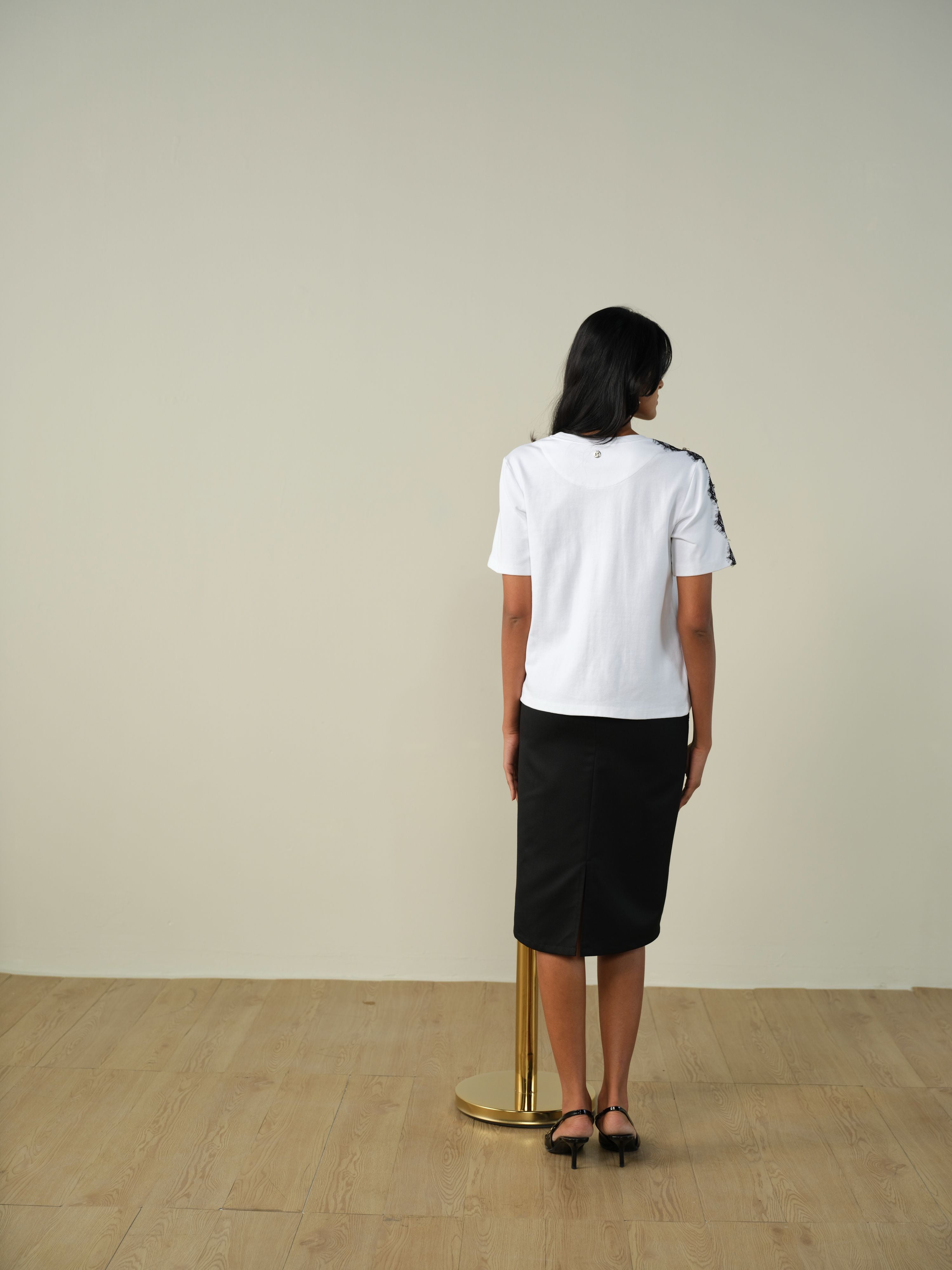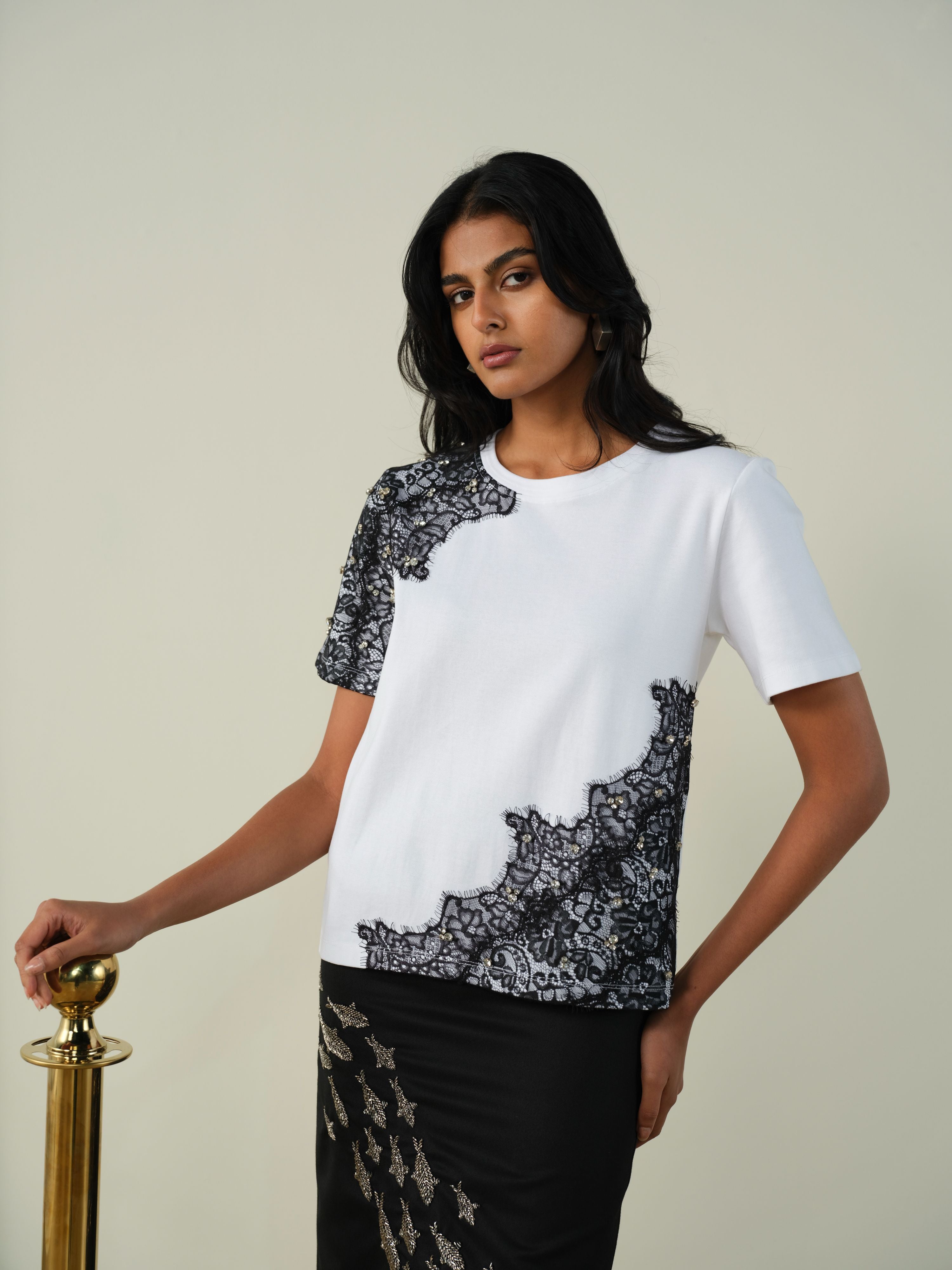 LACE APPLIQUE EMBELLISHED T-SHIRT