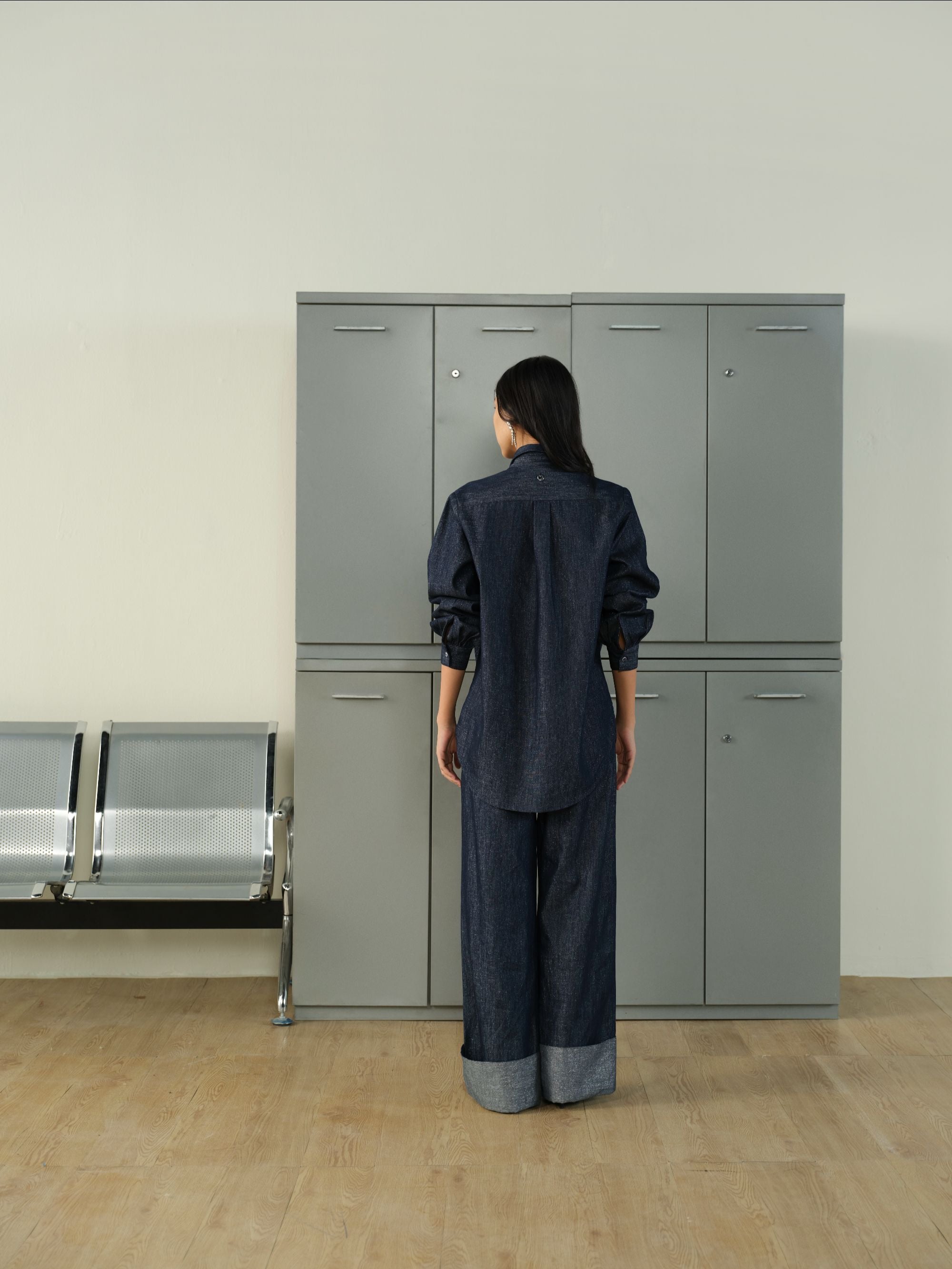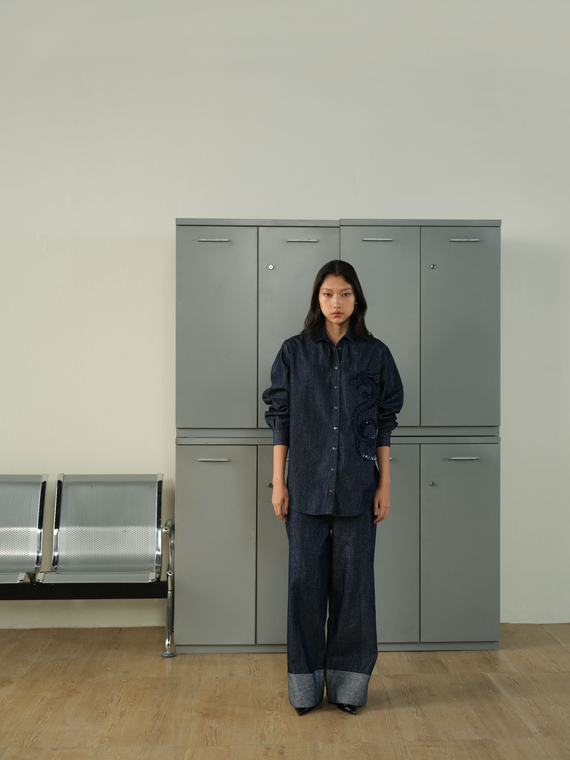DRAGON-EMBELLISHED LUREX DENIM MEETS CLEAN, WIDE-LEG TAILORING. A SET THAT FEELS MODERN, TEXTURED, AND EFFORTLESSLY BOLD.