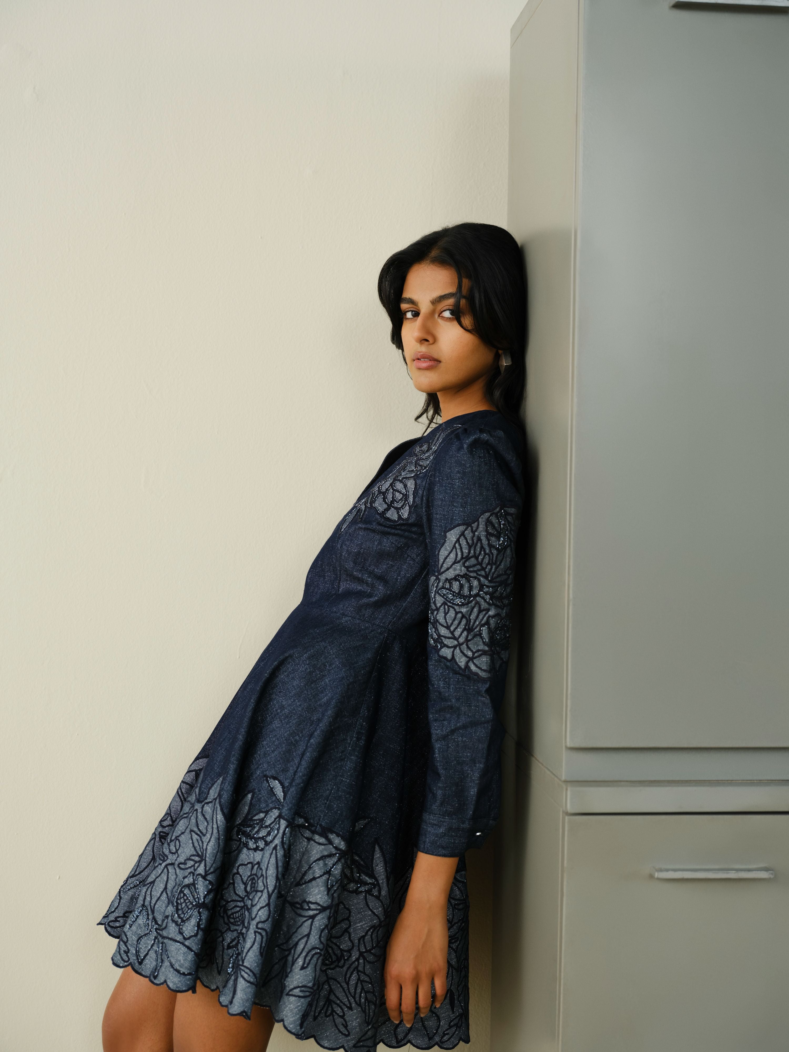 DESIGNED TO STAND OUT WITH SUBTLE SHIMMER, THIS LUREX-DENIM DRESS COMBINES PATCH EMBROIDERY WITH A CLEAN FIT-AND-FLARE SHAPE. THE V-NECKLINE AND FULL SLEEVES BRING BALANCED STRUCTURE, WHILE THE MINI LENGTH KEEPS THE LOOK FRESH AND MODERN.