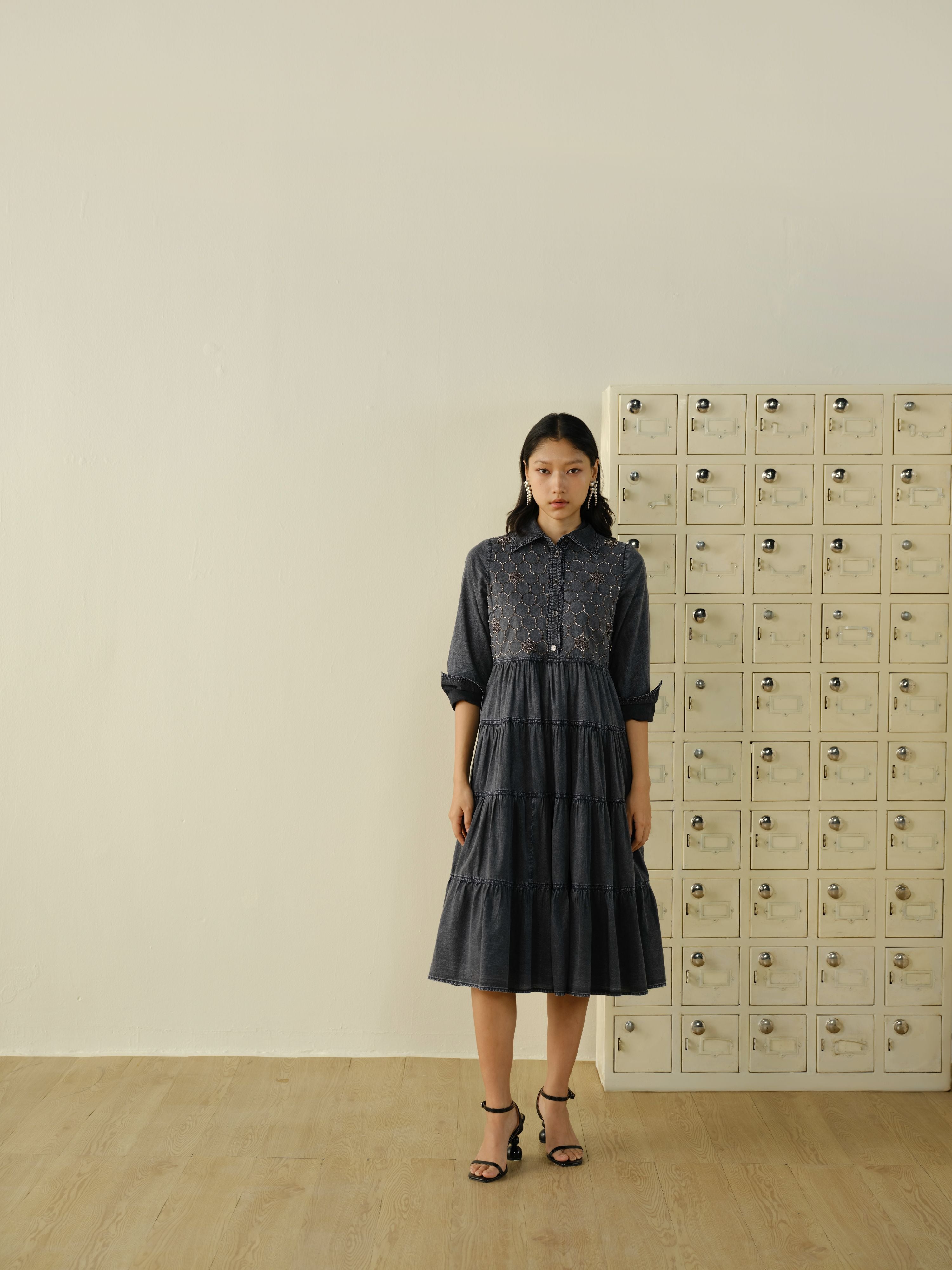 CUT FROM LIGHTWEIGHT COTTON, THIS SHIRT OVERDYED WASHED DRESS HAS FLOWY APPEAL WITH A FITTED SHORT-SLEEVED TOP AND AN AIRY TIERED SKIRT CRAFTED WITH GATHERS FOR ADDED VOLUME. THE FRONT HONEYCOMB EMBELLISHMENT - SMART COLLAR AND BUTTON FASTENING UNDERSCORE CLASSIC TAILORING CODES FOR ELEVATED STYLING.