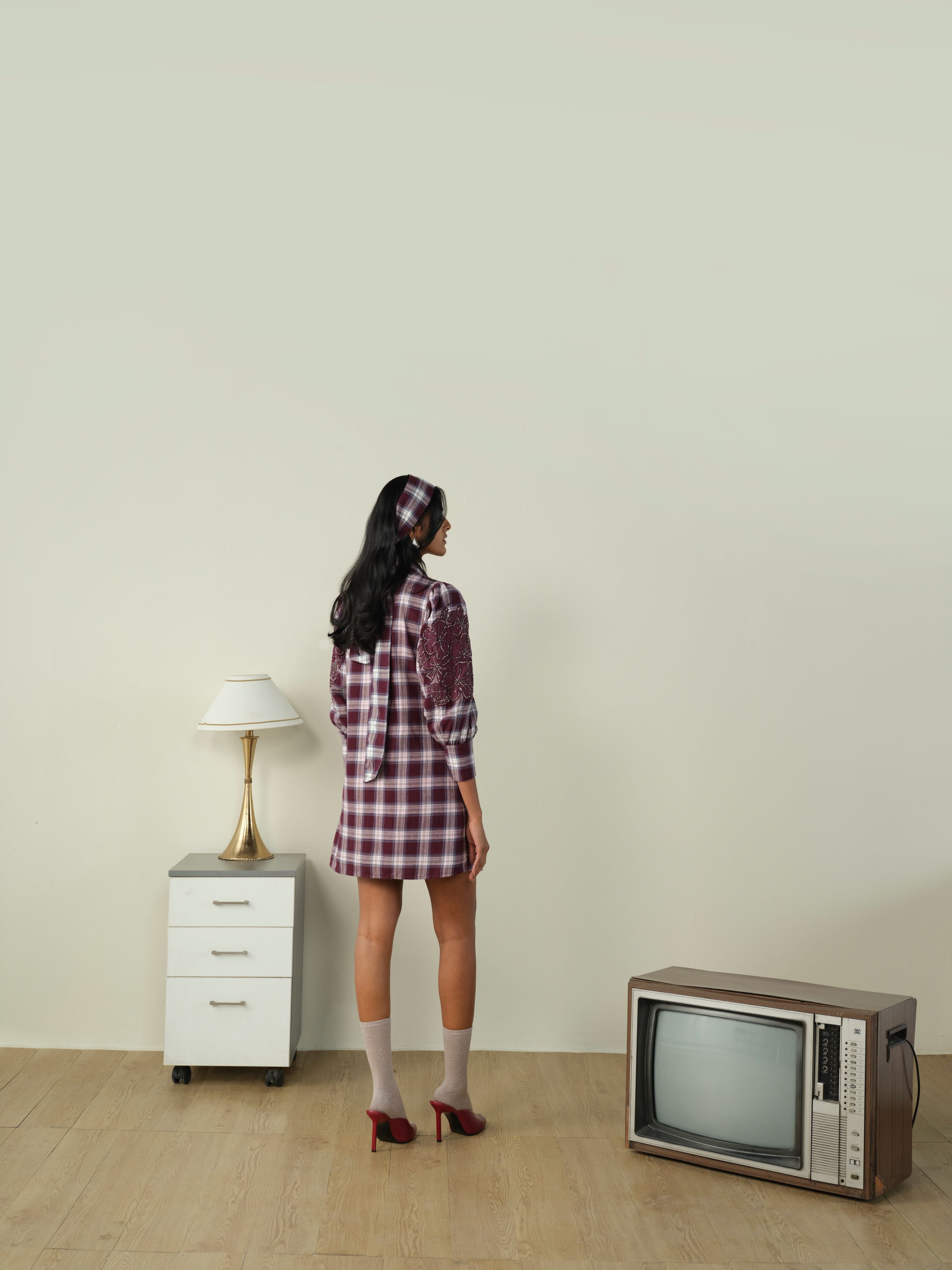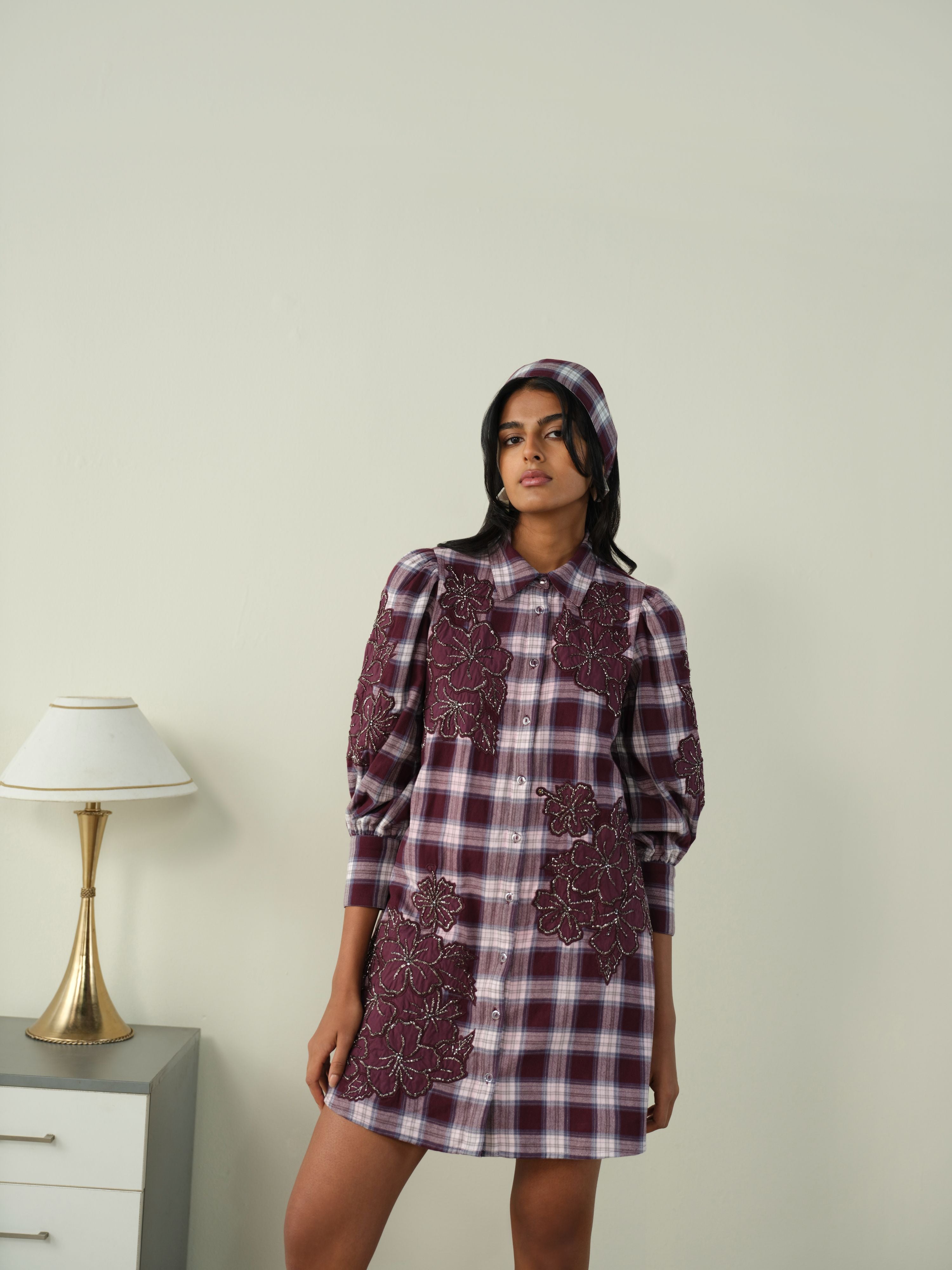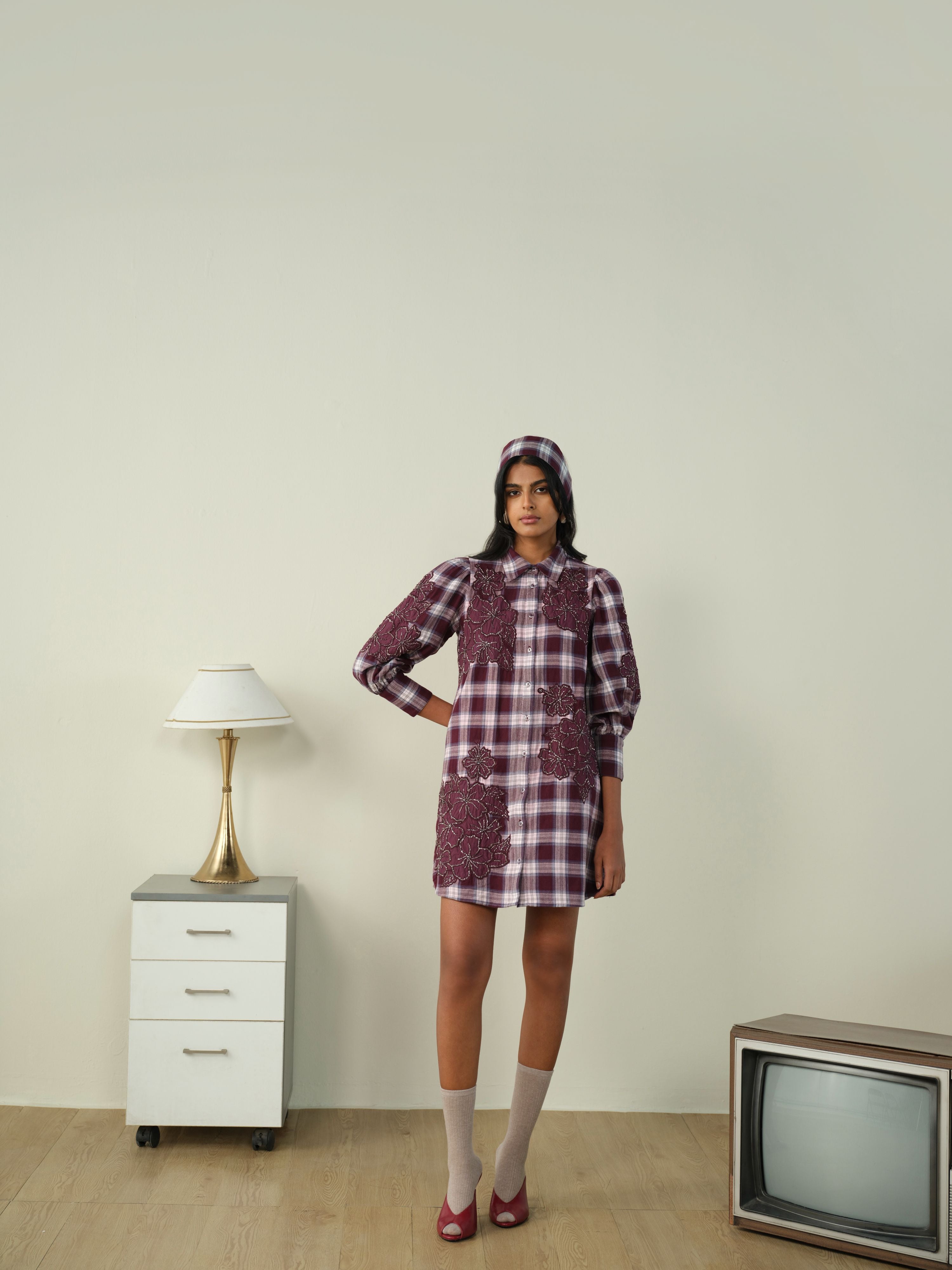 FOREVER-FLATTERING IN A CLASSIC SHIRT DRESS FEATURING SOFT COTTON CHECK WITH WHIMSICAL FLORAL APPLIQUES AND EMBELLISHED DETAILING WITH EMBROIDEREY THROUGHOUT.