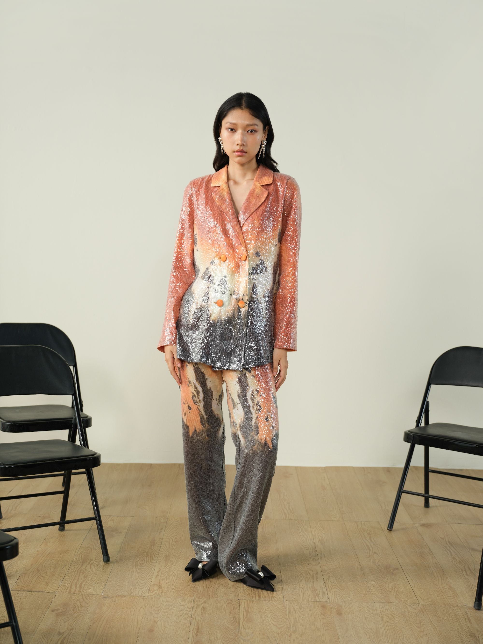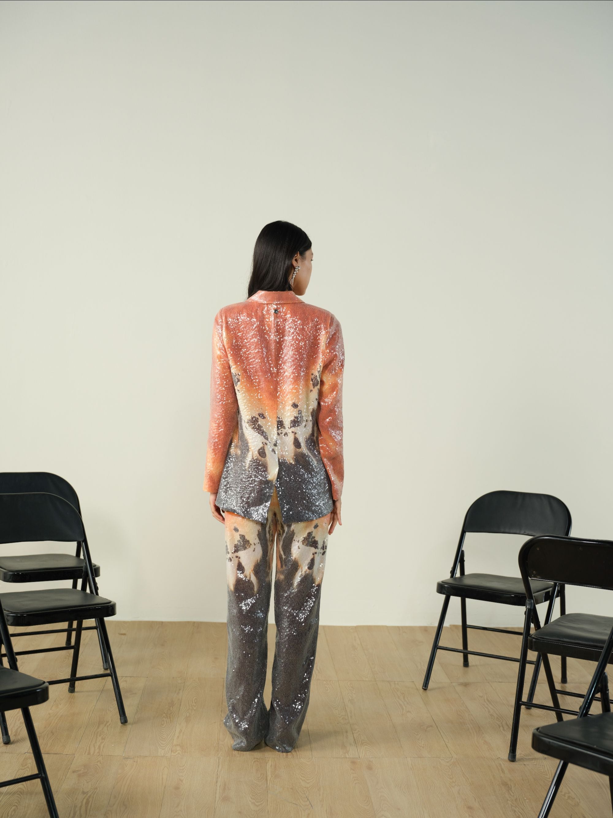 MAKE EVERY STEP SPARKLE WITH THIS STANDOUT SET. SEQUINED PRINTED PANTS MEET A DOUBLE-BREASTED BLAZER WITH ALL-OVER SEQUINS, NOTCHED LAPELS, AND FLAP AND WELT POCKETS—EFFORTLESSLY CHIC, UNAPOLOGETICALLY BOLD.