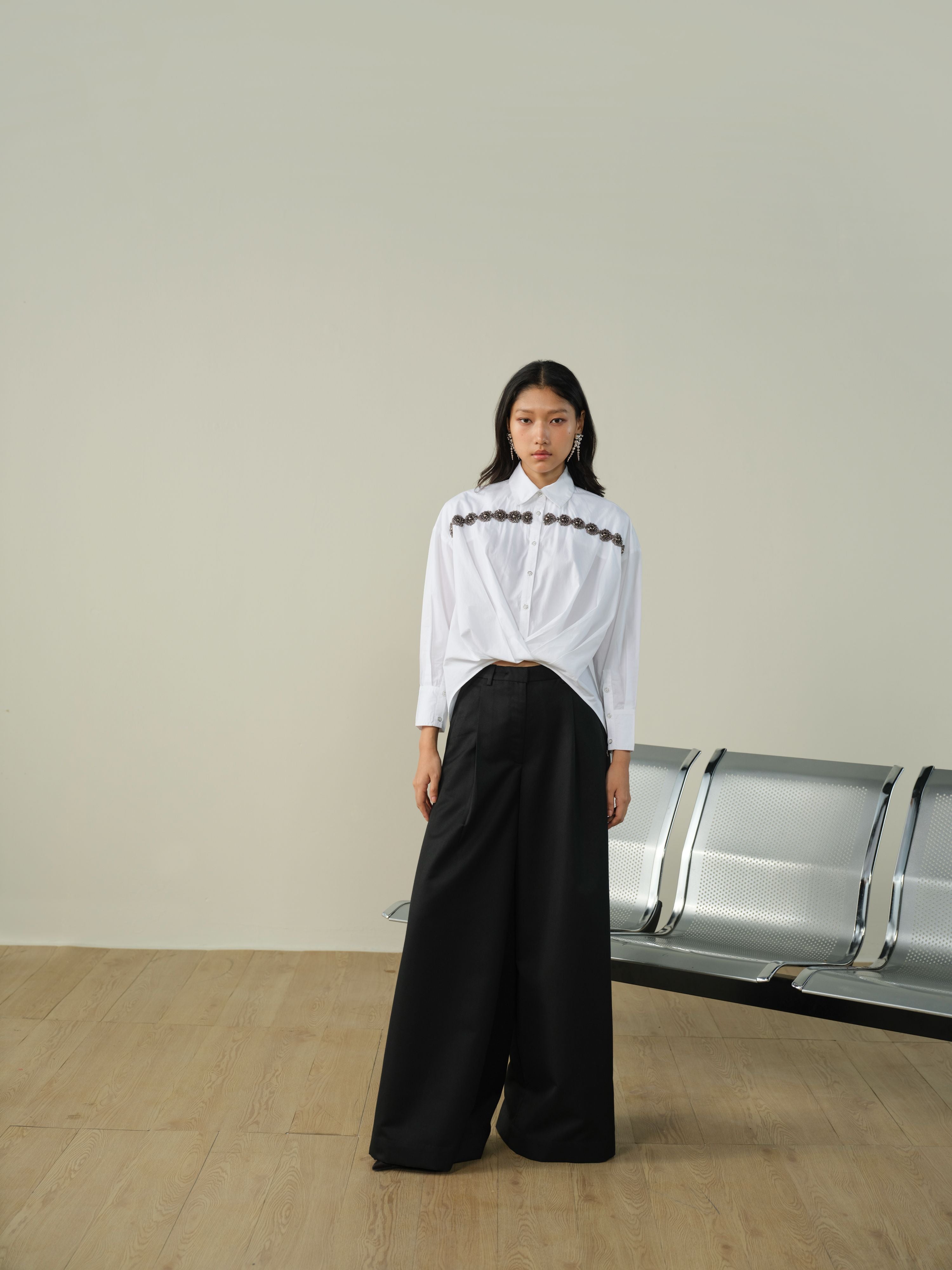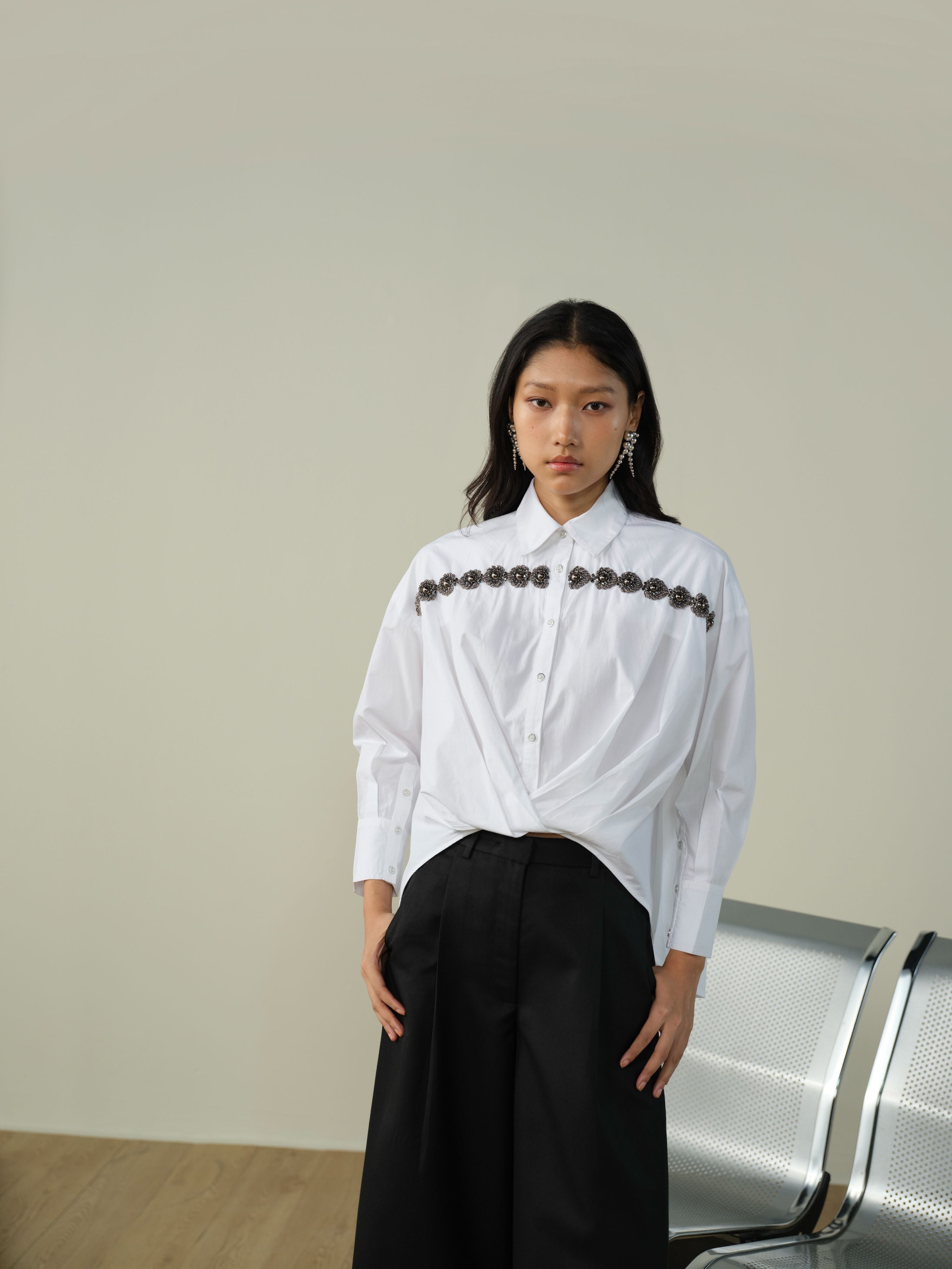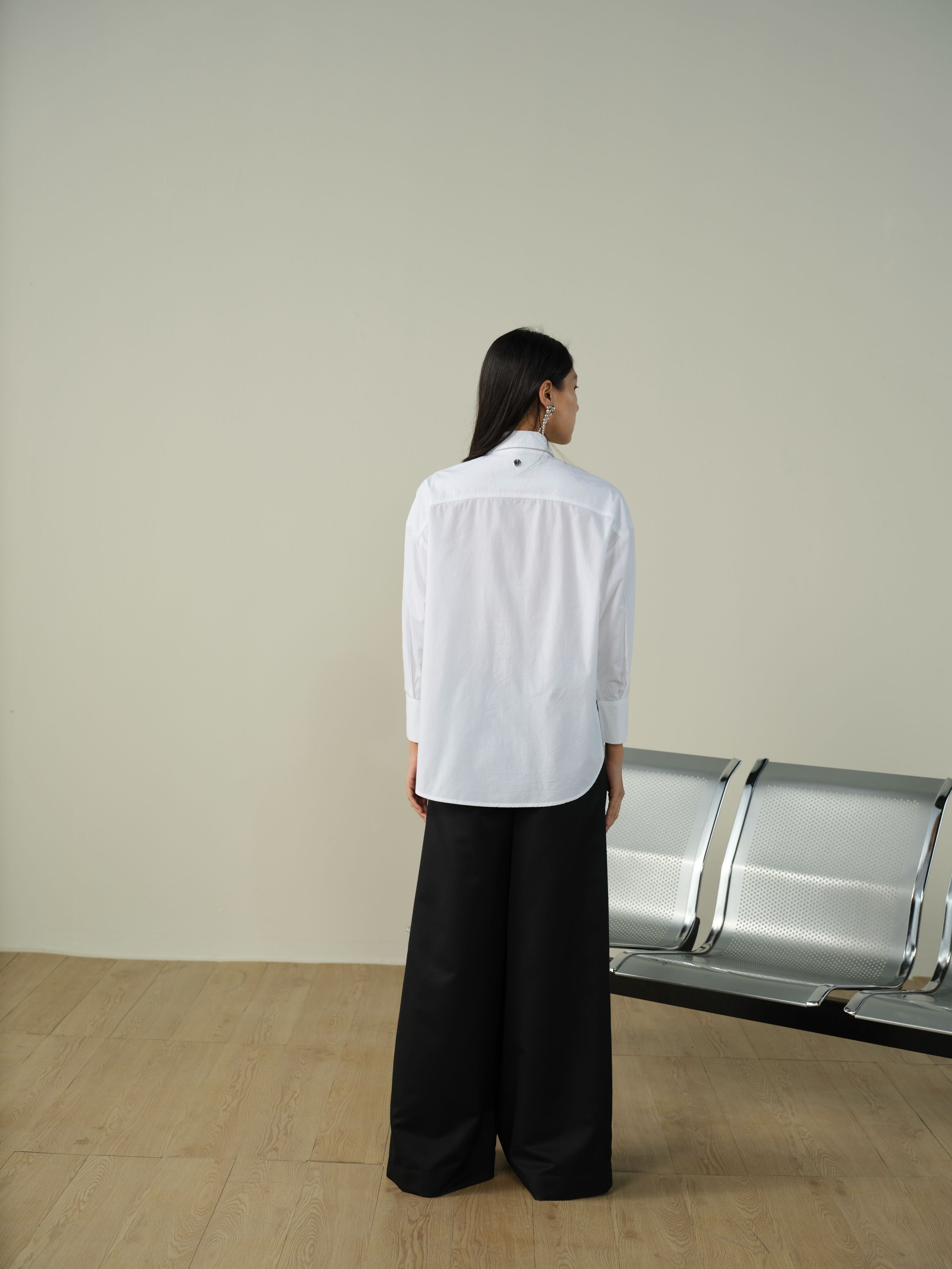 EMBELLISHMENT MEETS MINIMALISM IN THIS WHITE SHIRT, DESIGNED WITH A PLEATED HIGH–LOW HEM AND STRONG BROAD-CUFF SLEEVES. THE DROP-SHOULDER SILHOUETTE KEEPS IT MODERN, BALANCED, AND EASY TO WEAR.