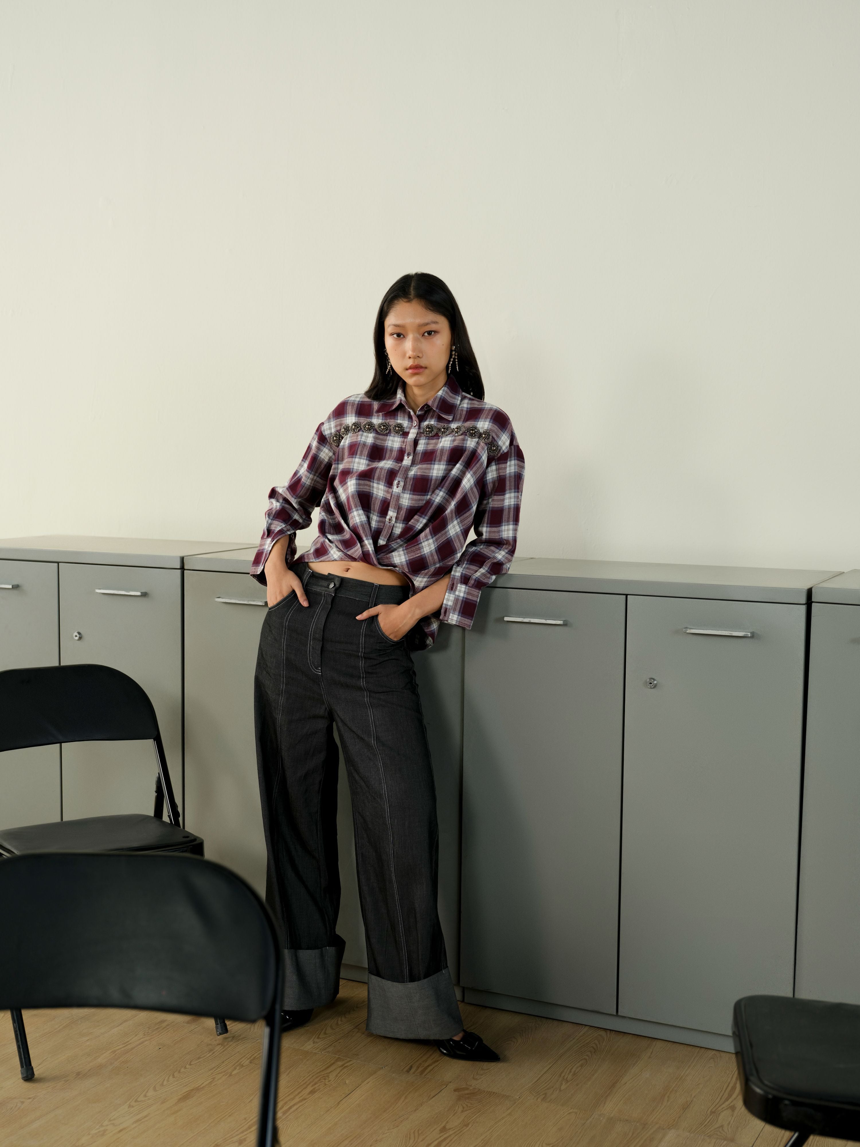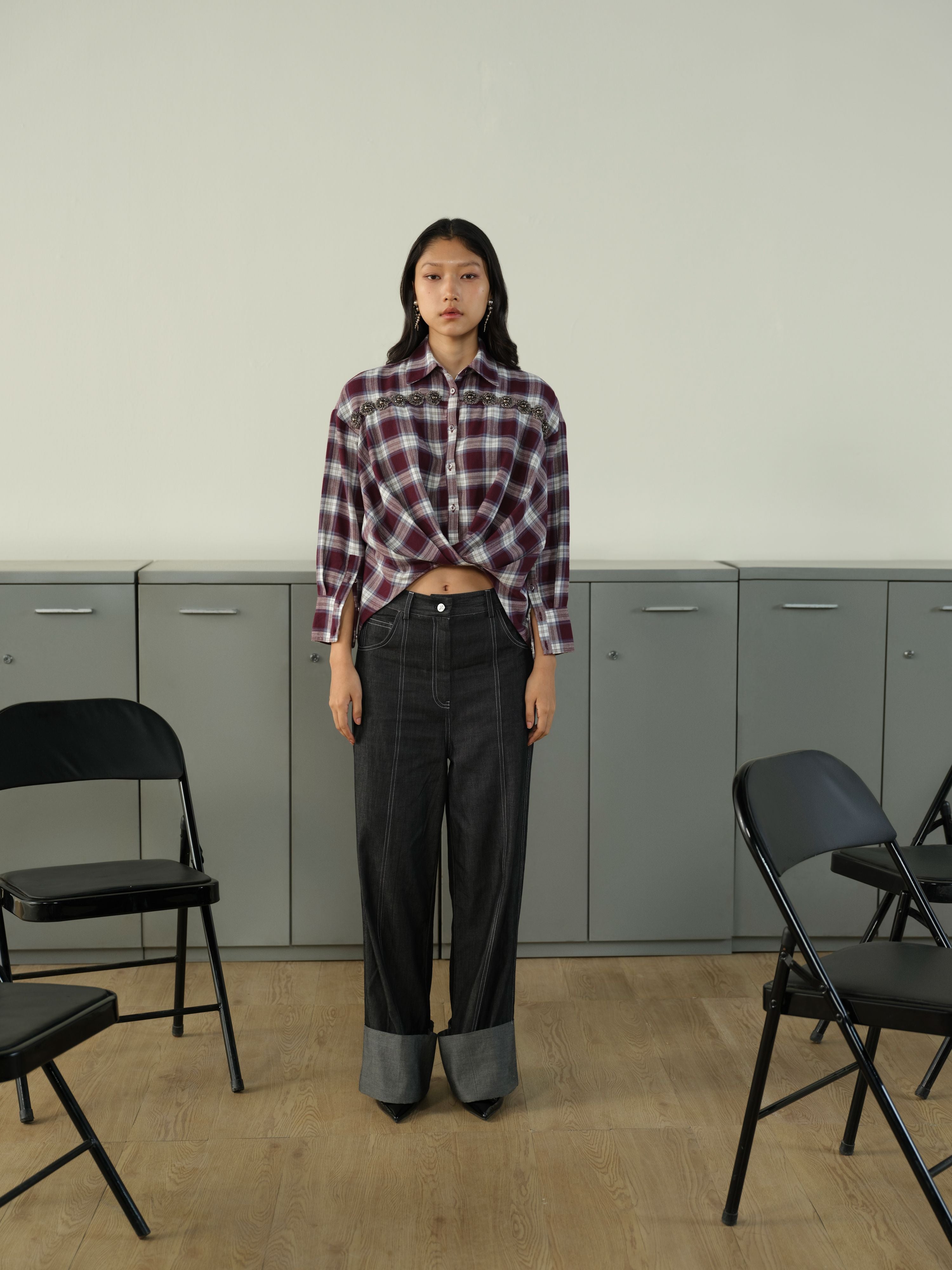 CHECK EMBELLISHED HIGH-LOW SHIRT
