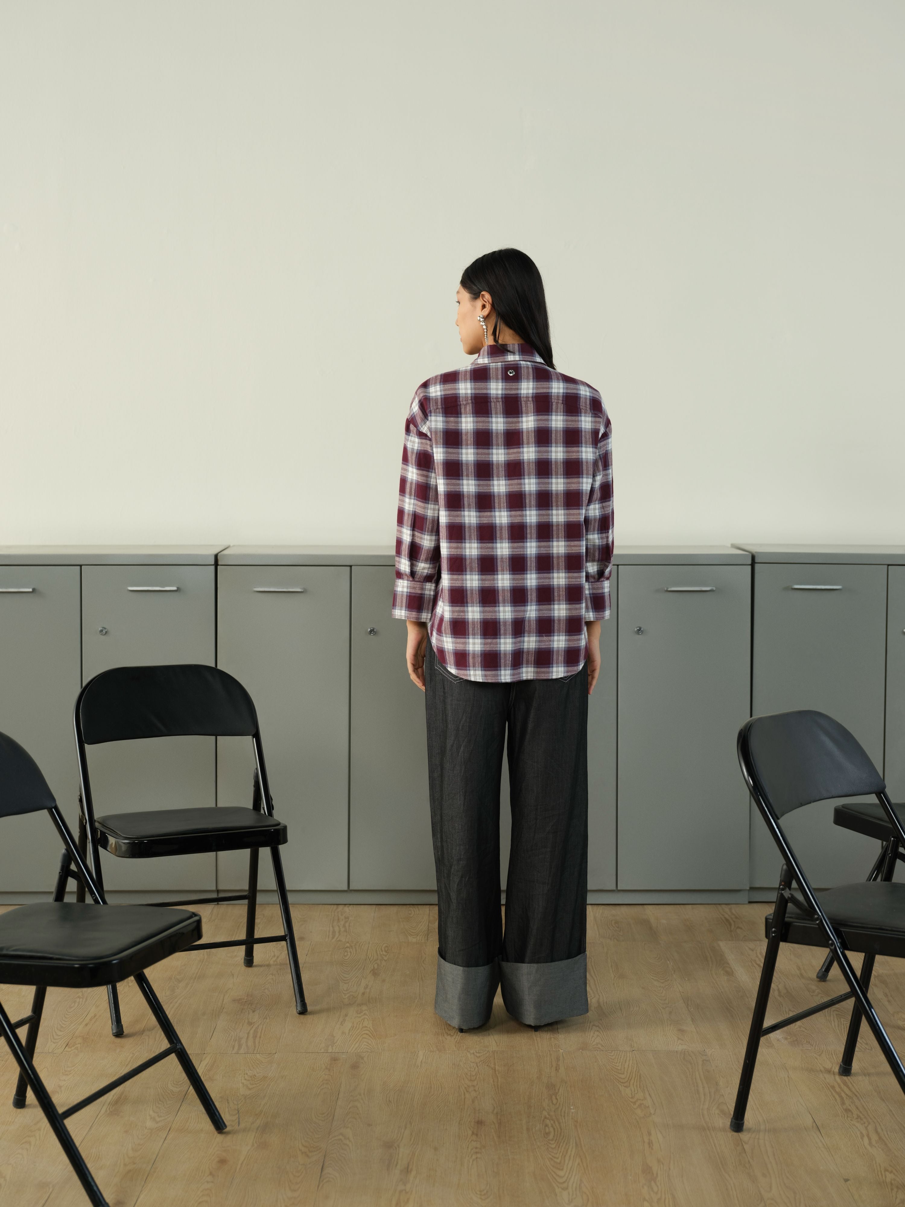 THIS RELAXED CHECK SHIRT PAIRS A DECORATED FRONT YOKE WITH A PLEATED HIGH–LOW HEM FOR A MODERN TWIST. DROP SHOULDERS AND BROAD-CUFFED SLEEVES ADD STRUCTURE TO THE OTHERWISE LAID-BACK SILHOUETTE.