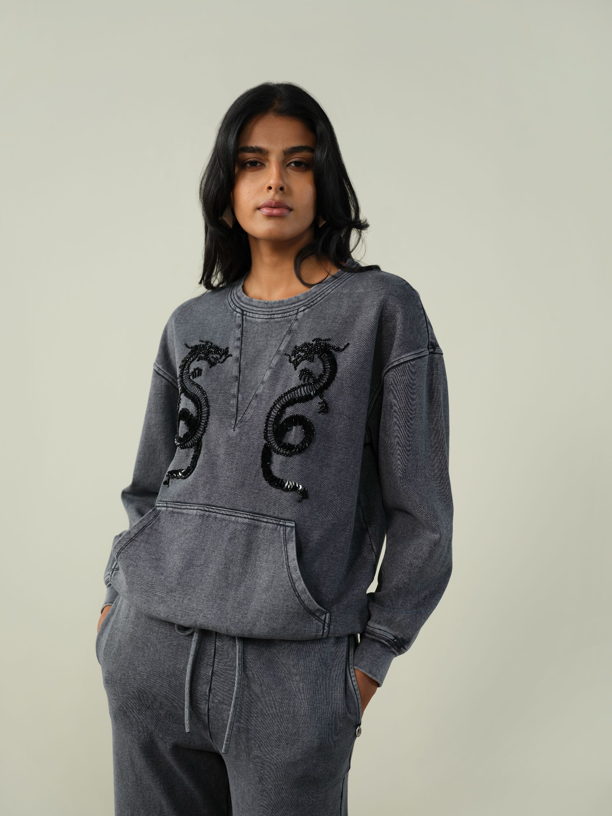 WHEN YOUR LOOK CALLS FOR STATEMENT ENERGY, THIS WASHED SWEATSHIRT RISES TO THE MOMENT. A DRAGON MOTIF AND JEWELLED EMBELLISHMENTS BRING STRIKING TEXTURE AND SHINE.
